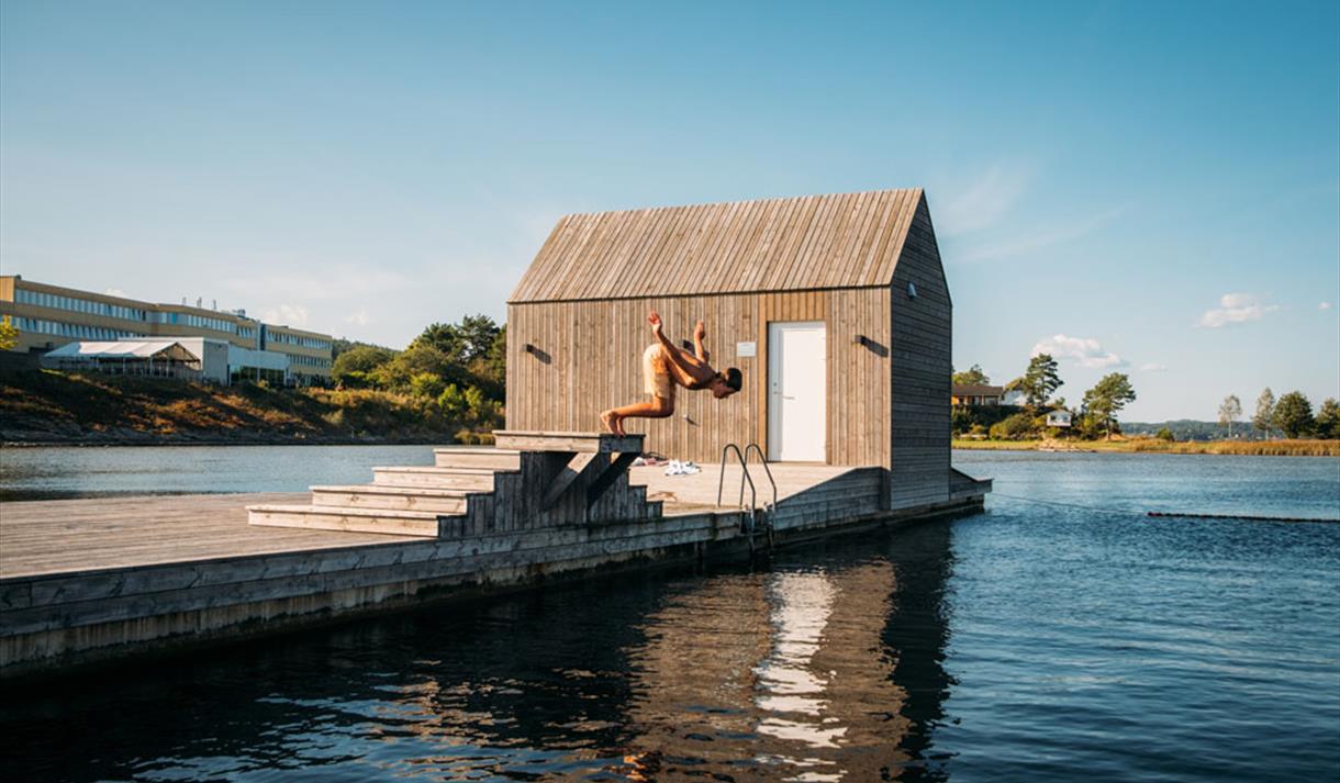 Her finner du fine uteområder med stupebrett og terrasserte bryggeområder for avslapning i sola eller trening.