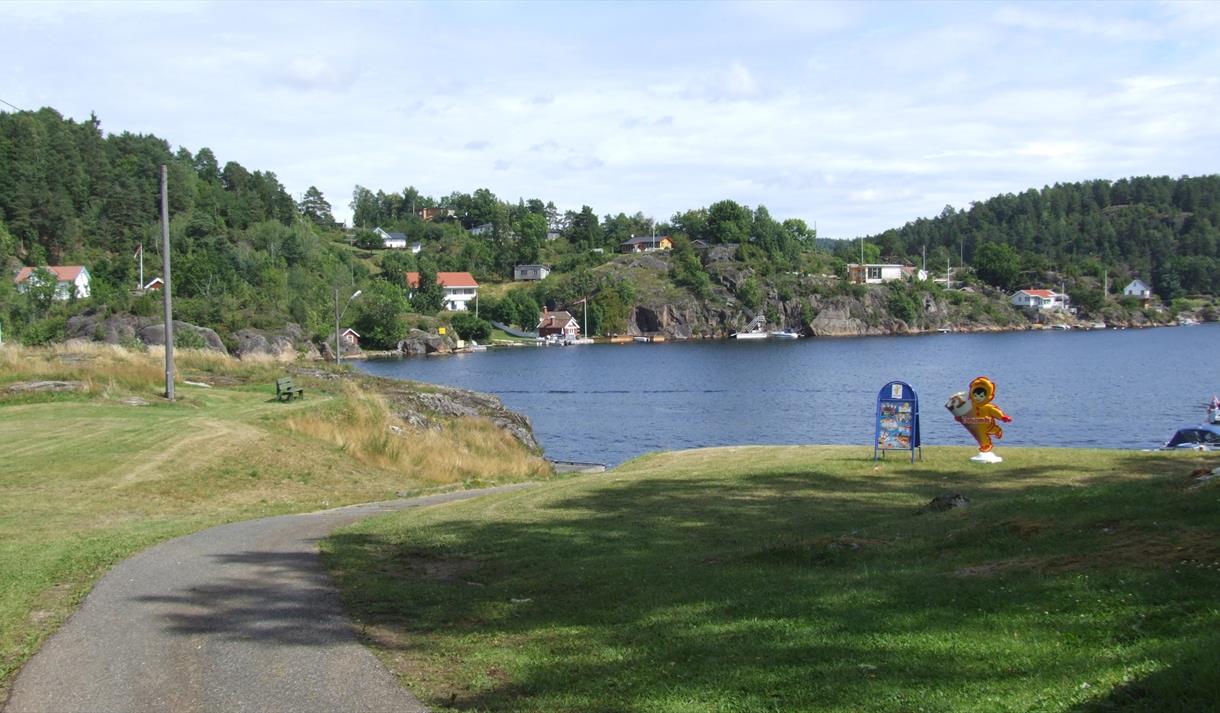 Alternativ 2: Gå direkte fra Løvøysundet på sti og grusvei til Sandøya sentrum ved Kommunebrygga og benytt de hyggelige omgivelsene og fasilitetene du finner der før retur til Brevik.