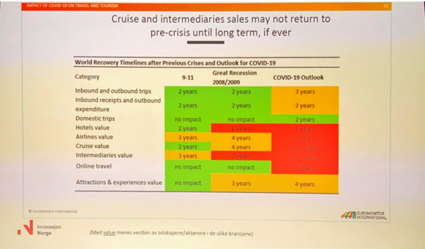 Euromotor International sine analyser av ringvirkninger av verdenskriser sier at det er flere aktører i reiselivet, blant annet cruise og turoperatører vil ta ca 10 år før de er tilbake der de var.