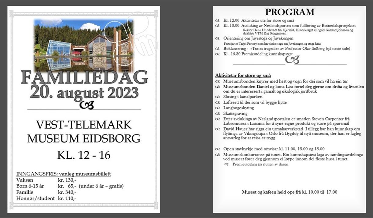 Den årlege Familiedagen på Vest-Telemark Museum i Eidsborg har også i år opplevingar og aktivitetar for heile familien. Museumsbonden Daniel køyrer hest og vogn, og han og kona Lisa fortel om drifta og livsstilen sin til dei som er interesserte i økologisk jordbruk.