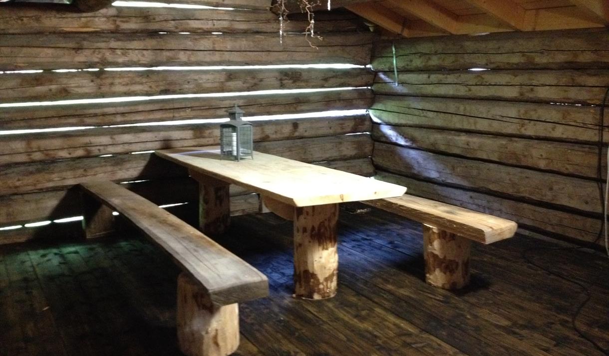 Om sumaren er det fint å sitje i hagegruppa på plenen framfor hytta ,eller i 2.etg der det er langbord med benkar.