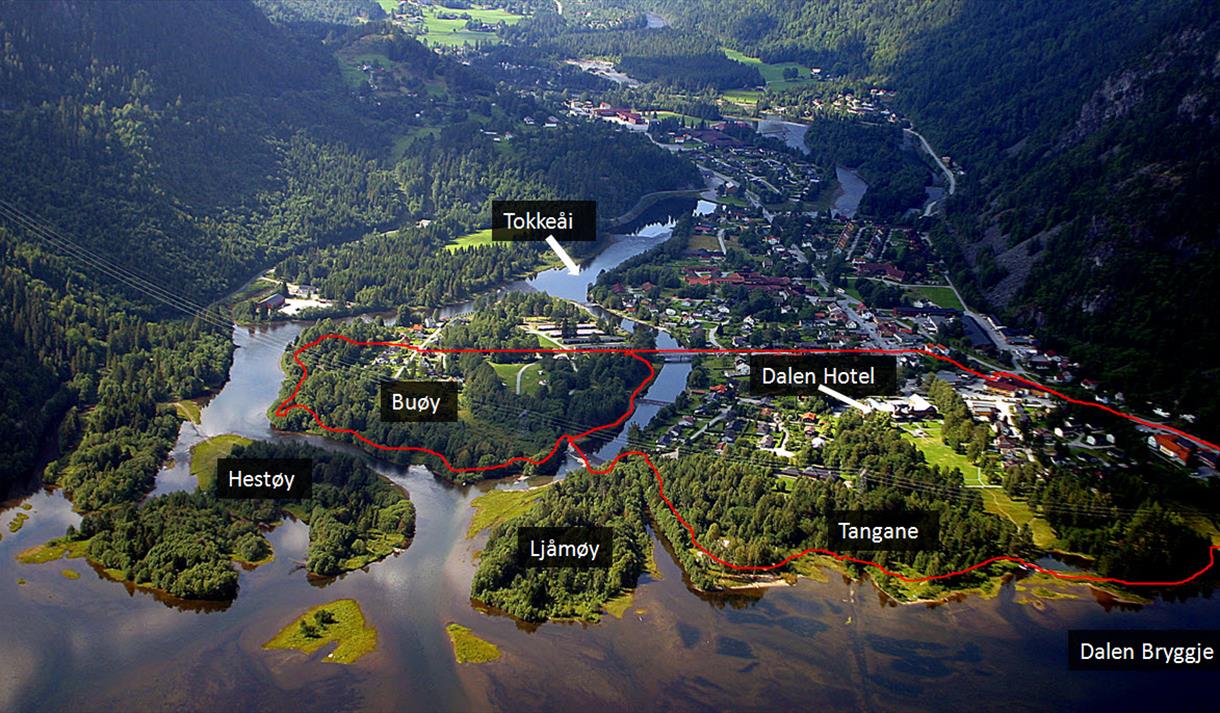 Frå bryggja passerar du ei fin badestrand og går vidare over Eidsborgbekken. Turen går no forbi Tangane, eit viktig friluftsområde med idyllisk furuskog. Her får du innsyn til Dalen Hotel frå hagen.