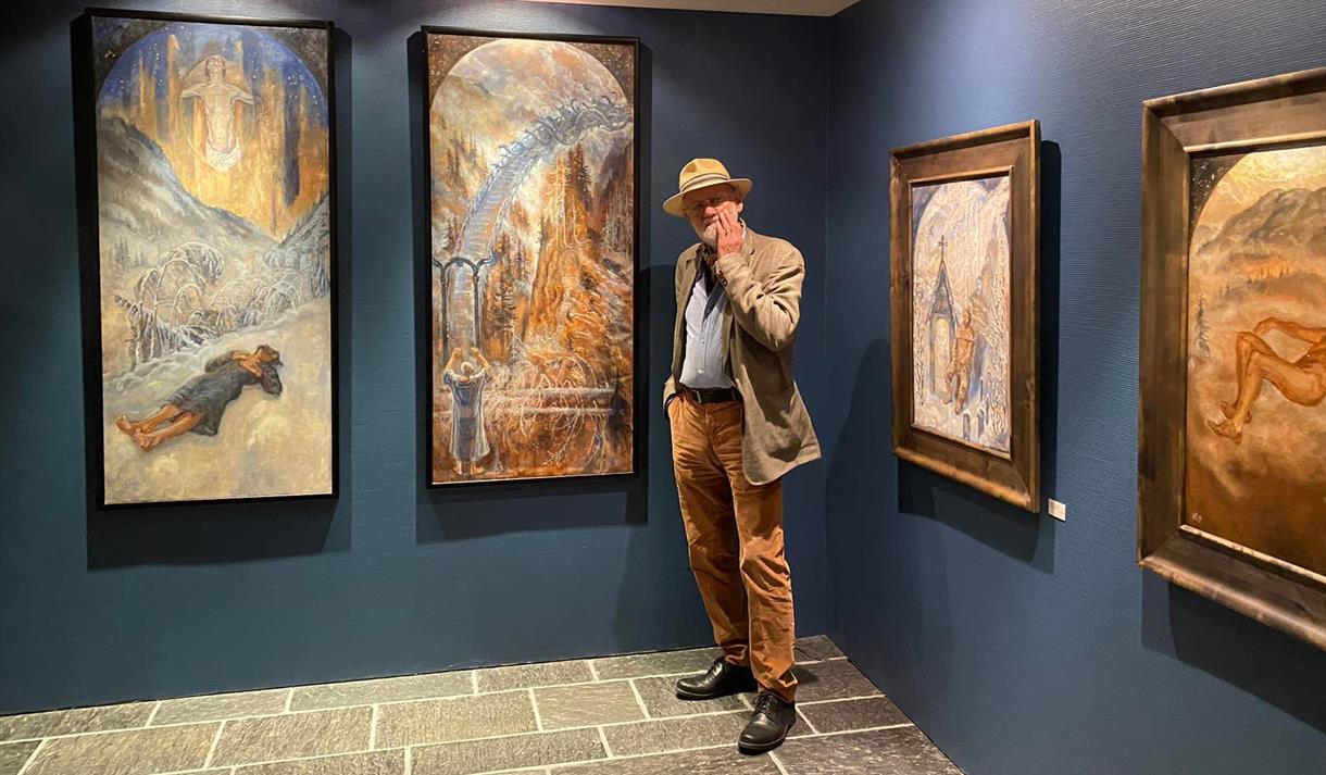 I underetasjen finn du ei utstilling med måleri om Draumkvedet av Karl Erik Harr. I tillegg er det her årlege salsutstillingar i regi av lokalstyret.