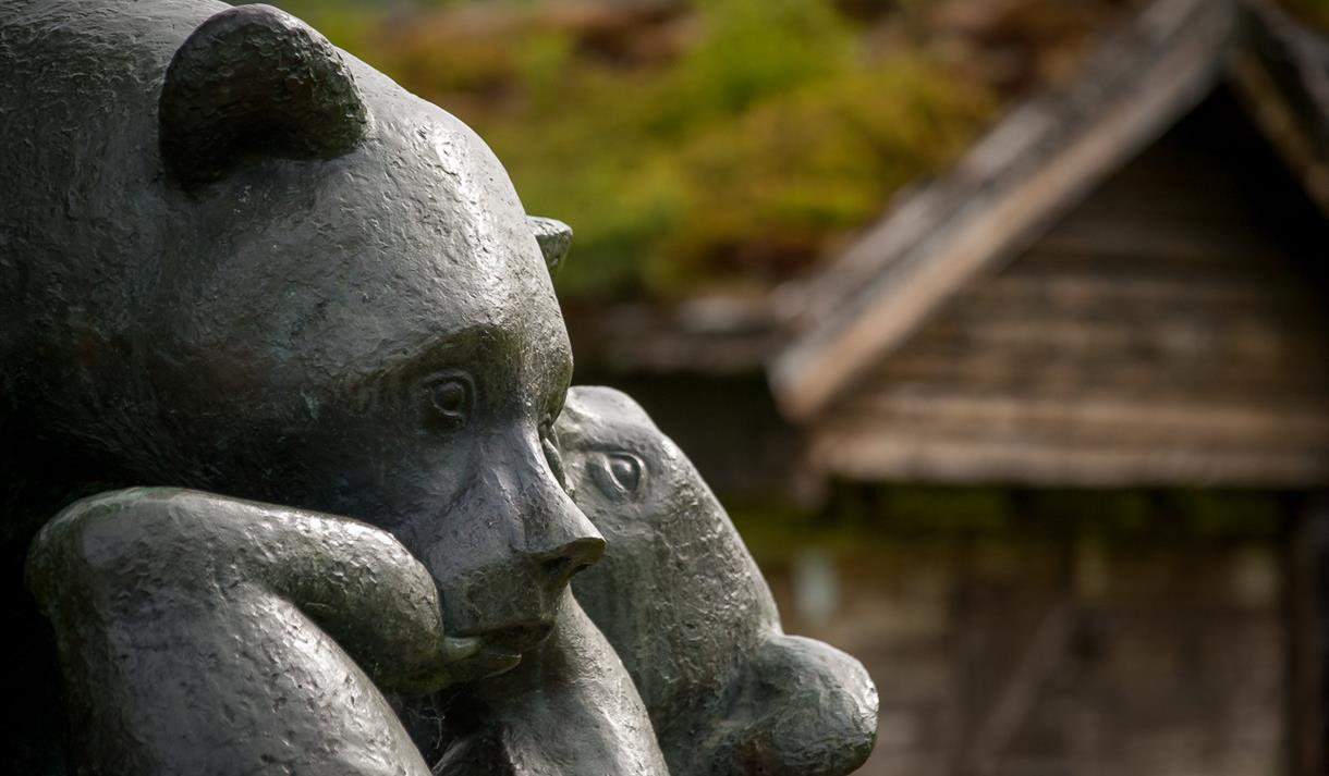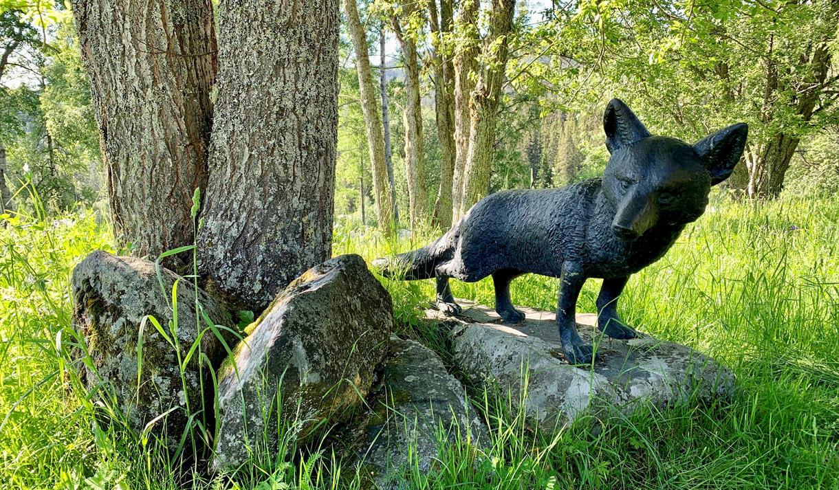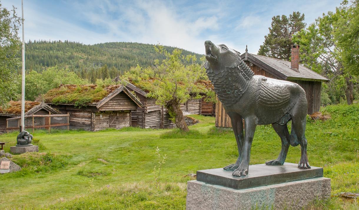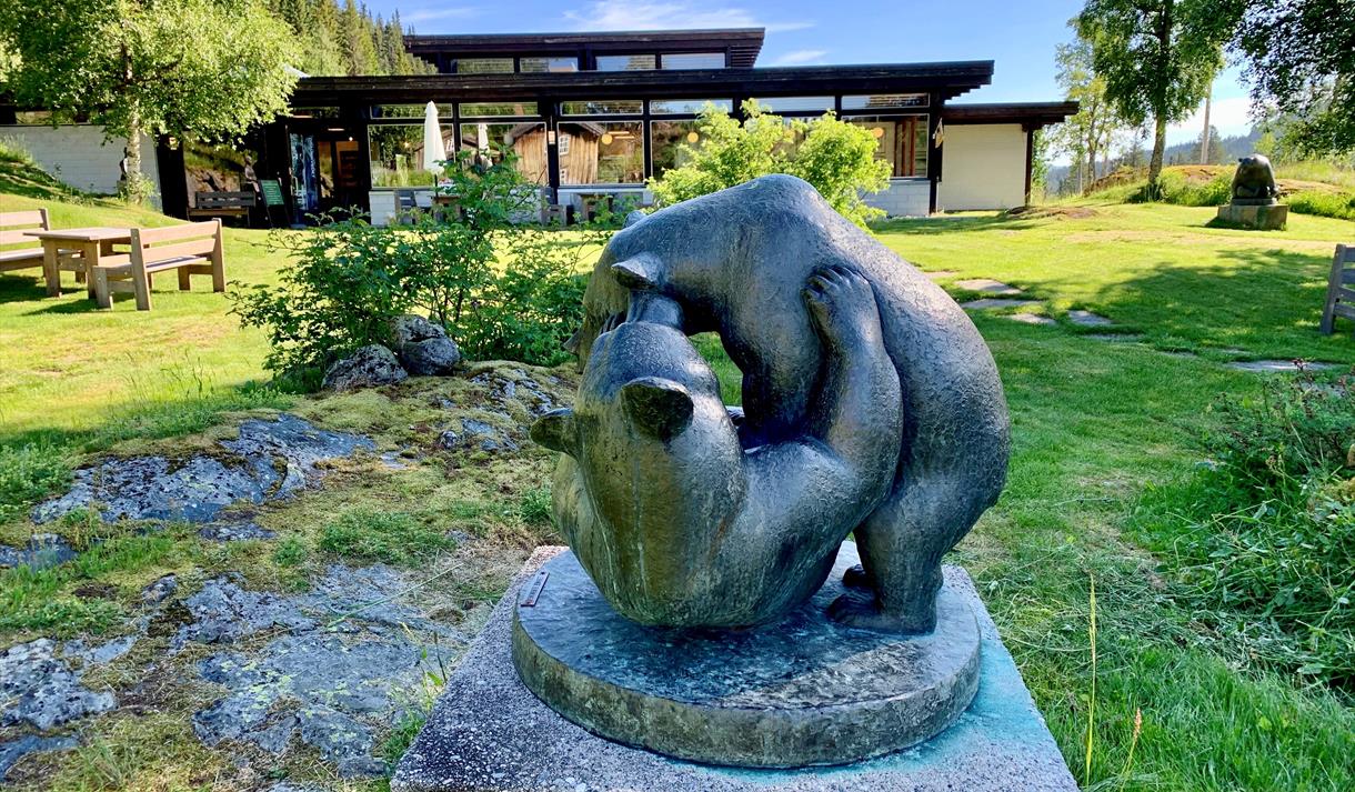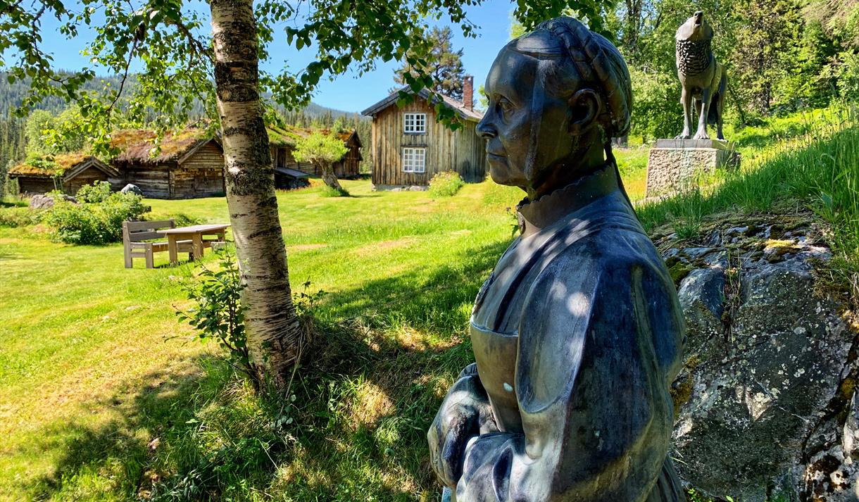 I den eine enden av tunet ligg museet som presenterer kunstnaren Anne Grimdalen, men ein del av hennar skulpturar er også plassert utandørs.