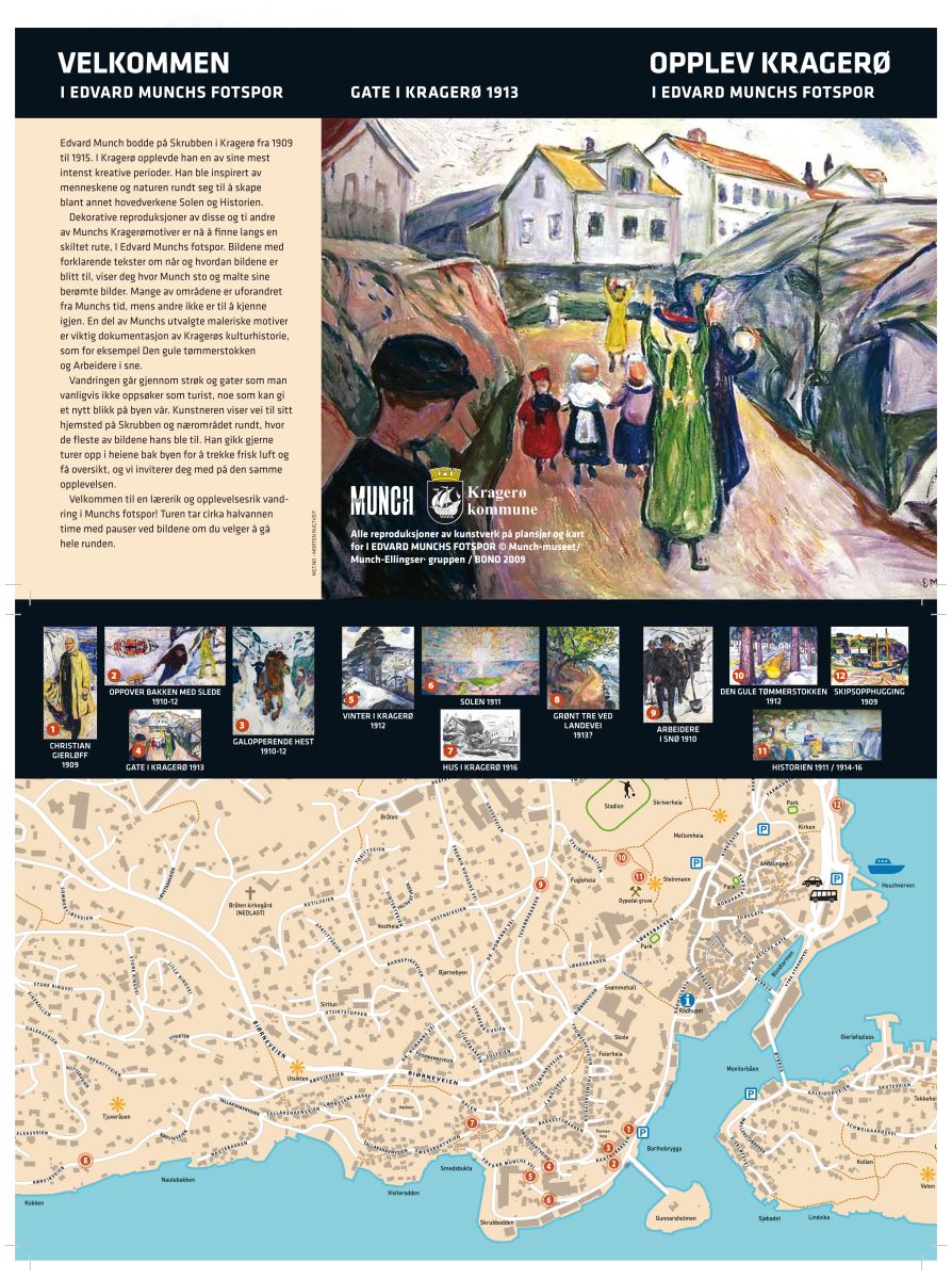Dekorative reproduksjoner av Munchs hovedverk fra Kragerø er å finne langs en skiltet rute. Bildene med forklarende tekster om når og hvordan bildene er blitt til, viser deg hvor Munch sto og malte sine berømte bilder. Mange av områdene er uforandret fra Munchs tid, mens andre ikke er til å kjenne igjen. En del av Munchs utvalgte motiver er viktig dokumentasjon av Kragerøs kulturhistorie, som for eksempel Den gule tømmerstokken og Arbeidere i sne. Vandringen går gjennom strøk og gater som man vanligvis ikke oppsøker som turist, noe som kan gi et nytt blikk på byen vår. Turen tar cirka halvannen time med pause ved bildene om du velger å gå hele runden.
