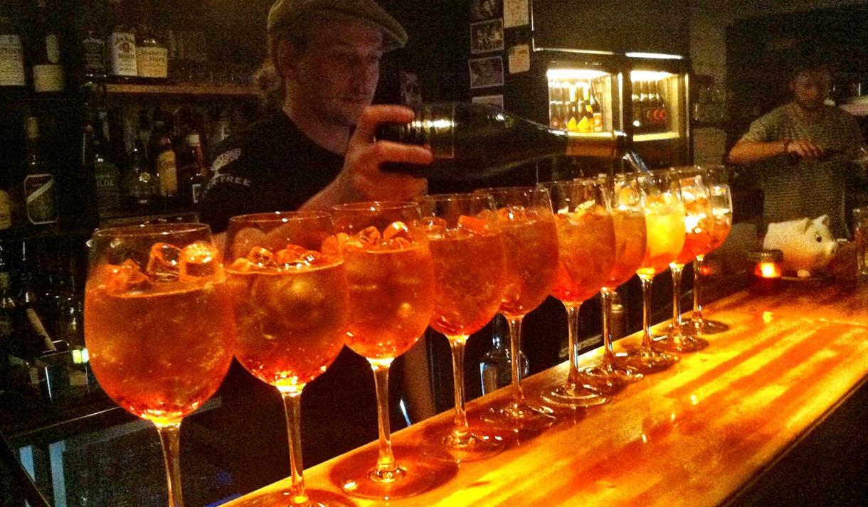 Jensemann Pub langs brygga tett ved bybrua i blindtarmen - et vannhull ved vannkanten med egen brygge. Her kan du legge til med båten og nyte et glass i en hyggelig og intim atmosfære. God service og hyggelige mennesker som står bak baren.