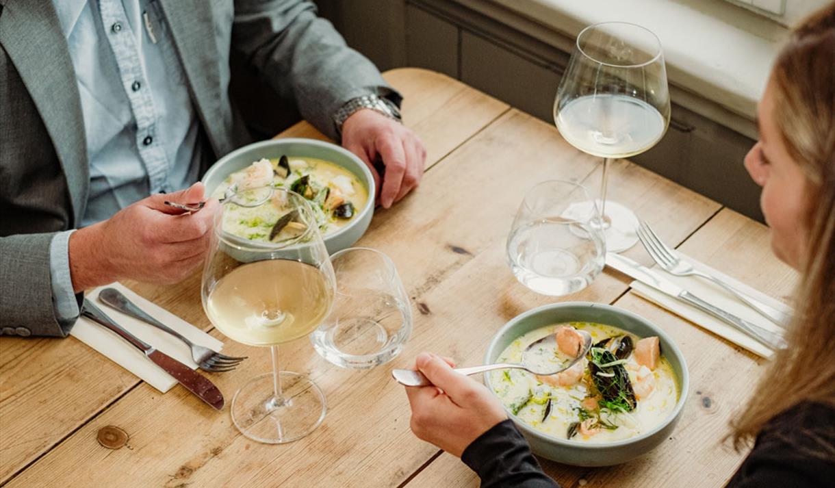 Tollboden har en lidenskap for mat og vin, noe som gjenspeiles i menyen som varierer med årstiden og som alltid baseres på råvarer av høy kvalitet.