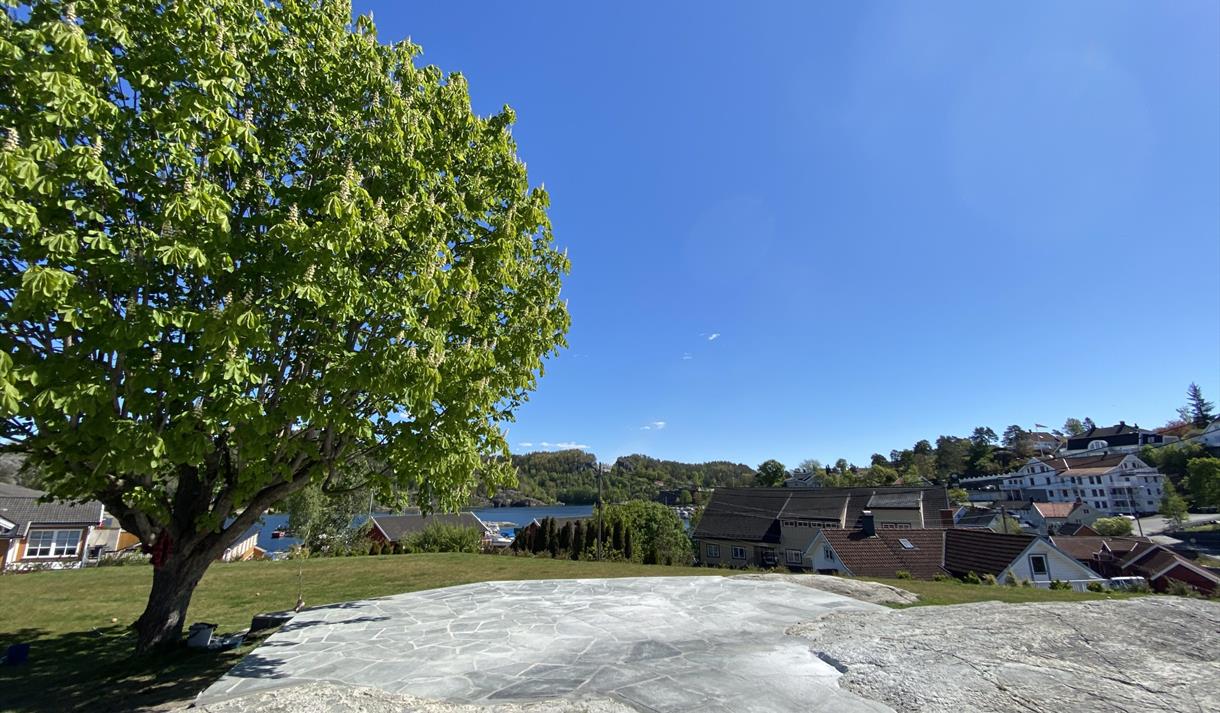 Minneparken ligger like ved Kragerø Kirke. Her står det en bauta over de falne…
