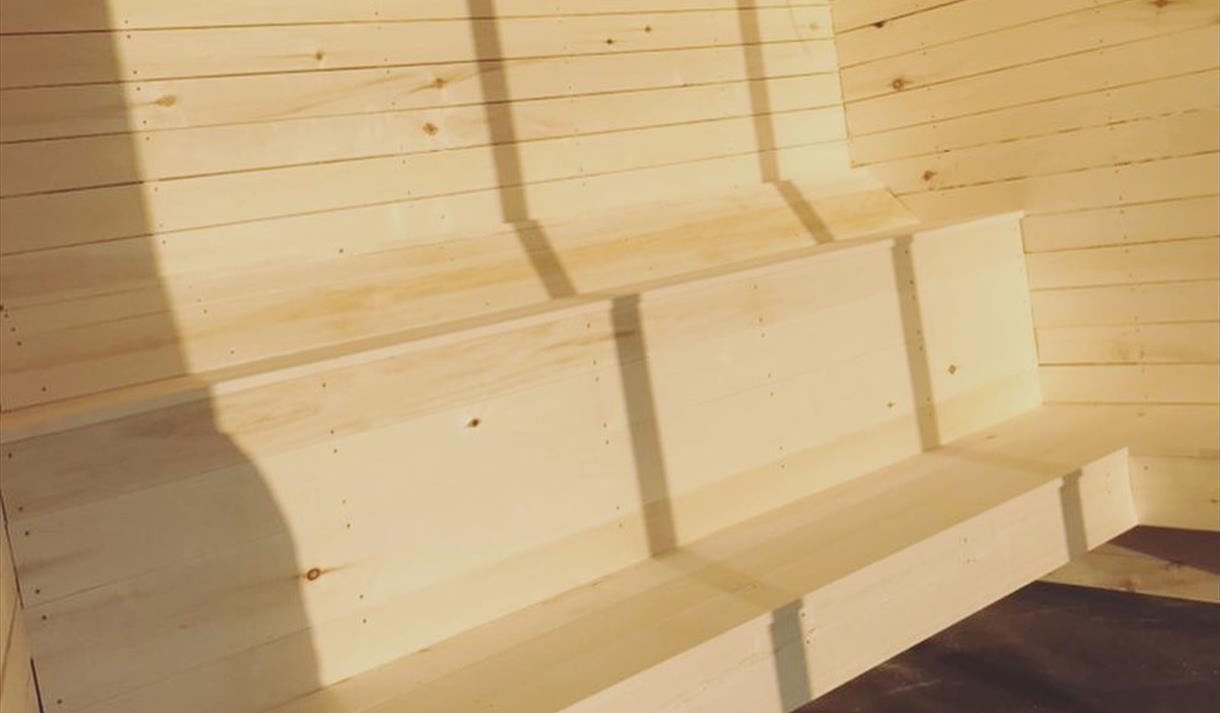 Badstuen har plass til opp til 14 personer, og ble ferdigstilt i 2021. Du kan velge drop in time, eller privat booking slik at du og reisefølget ditt kan ha badstuen helt for dere selv.