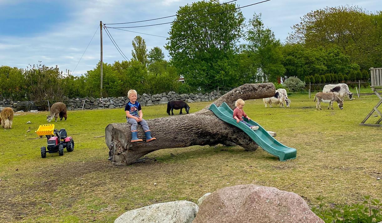 Her kan du se mange forskjellige dyr som kaniner, marsvin, ullgris, minigris, lama, emu, påfugl, høner, hester, vak, mini esel, sauer, geiter og ponnier. Noen av dyrene kan du inn å klappe og hilse på og evt ta en runde på hesteryggen. (kr 50,- ekstra for ridetur). Du kan også klatre og hoppe i høyet, leke og nyte medbrakt mat og drikke.