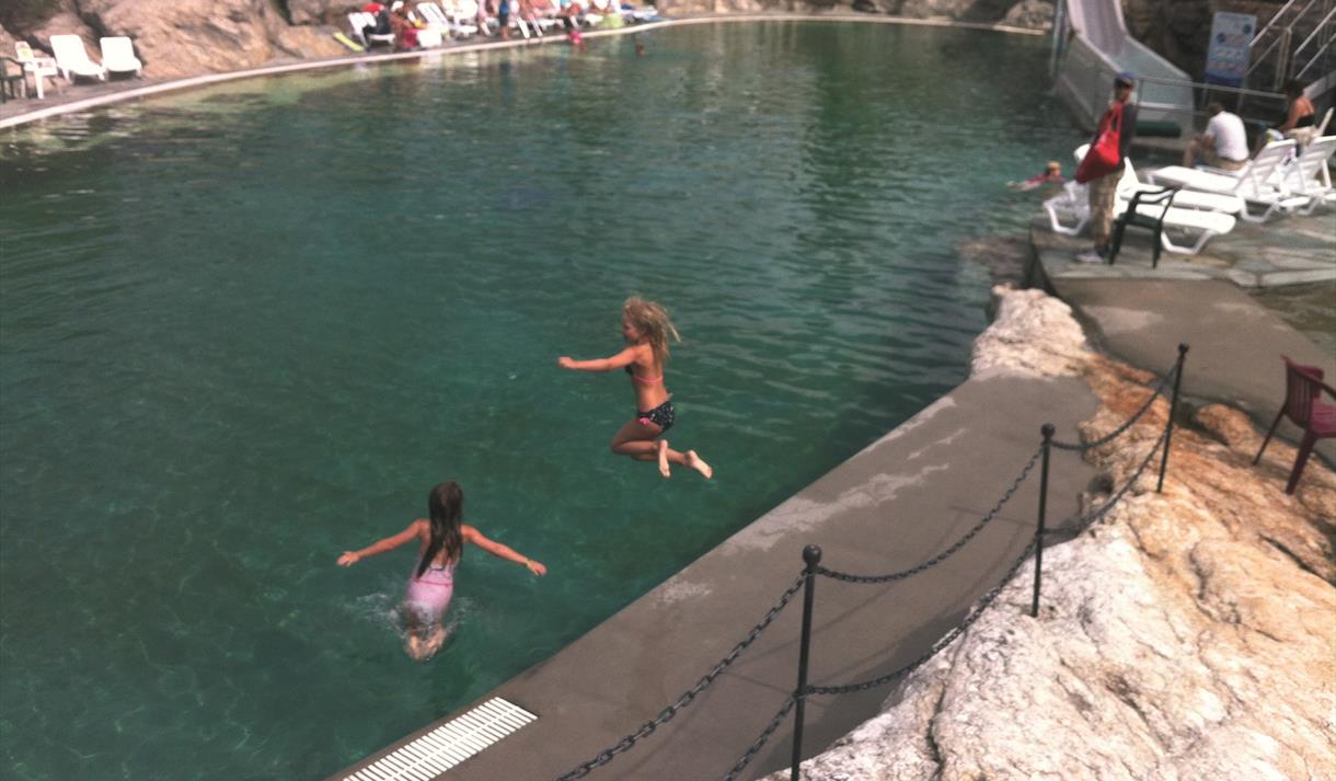 Anlegget består av et hovedbasseng og et lite barnebasseng, vannet er klor-holding sjøvann som blir oppvarmet til 26º grader. I bassenget finnes det også en rutsjebane samt to vannpolomål. Bassenget er sprengt inn i fjellet, dette gjør at anlegget ligger i ett med naturen og ikke er synlig for utenforstående. Bassenget åpner vanligvis rundt St.hans.