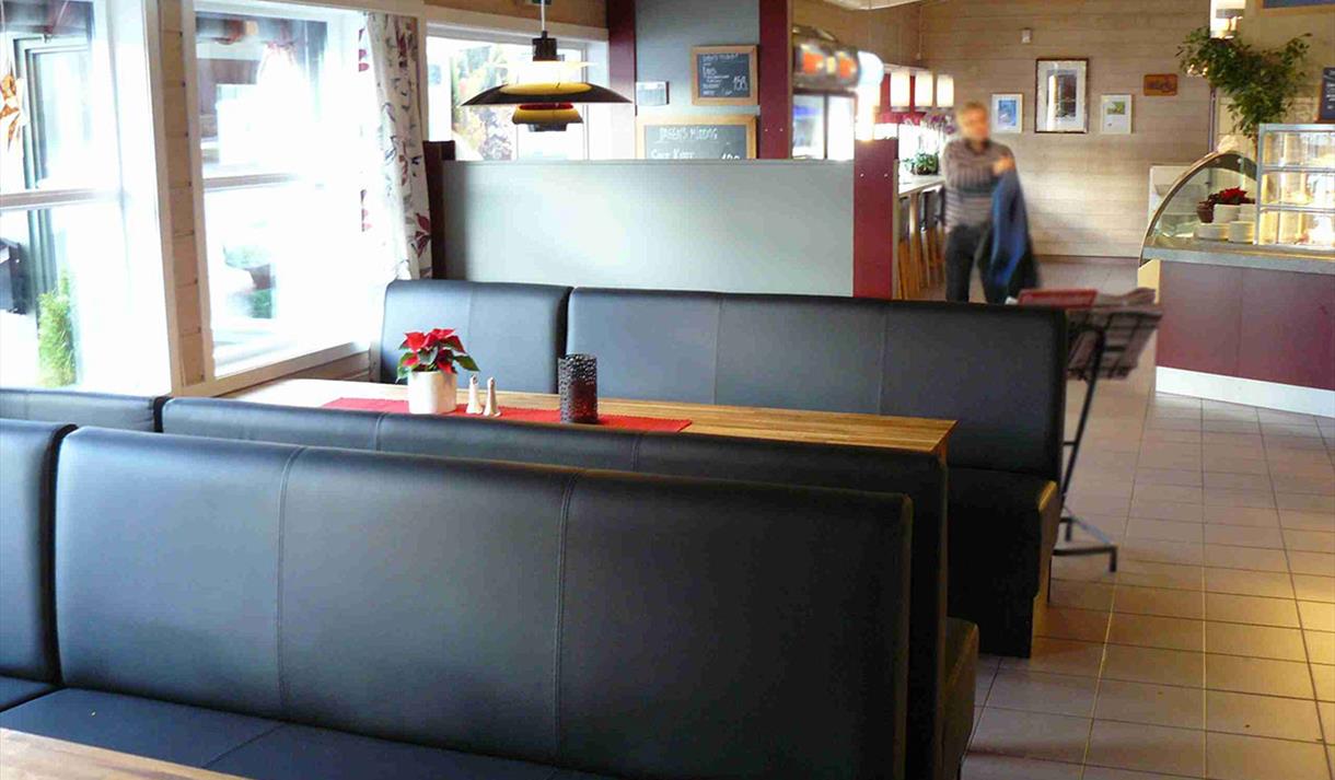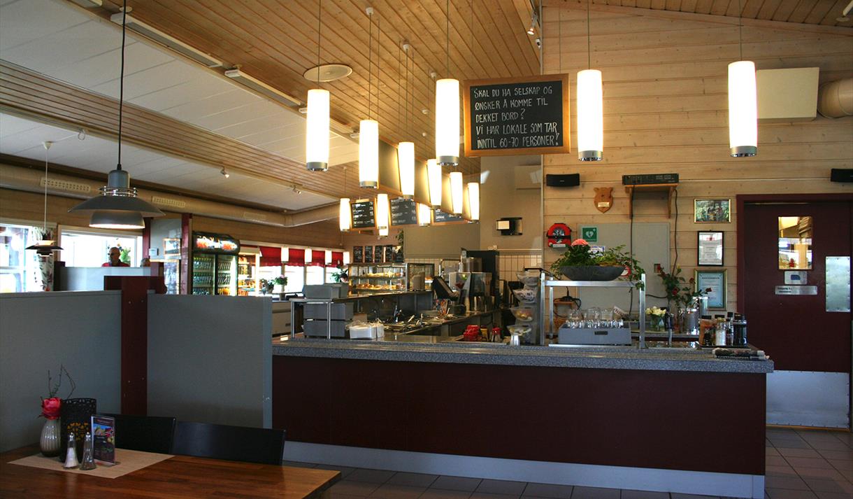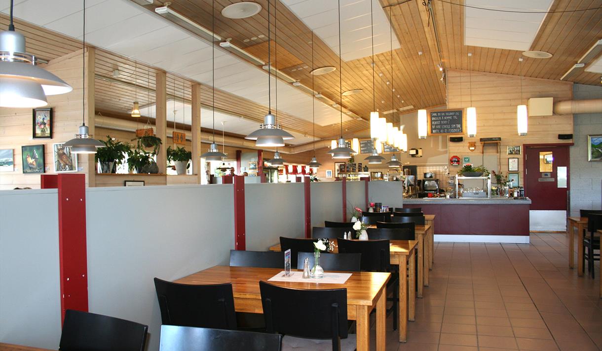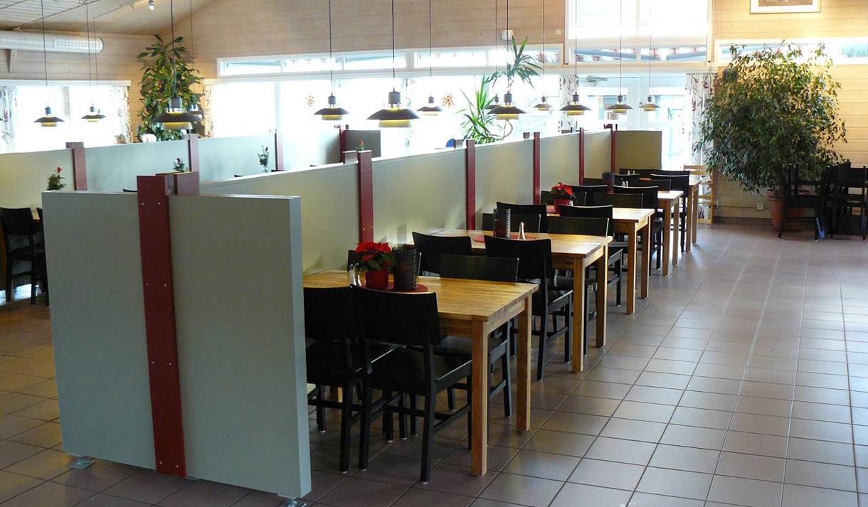 De store lyse lokalene med høyt til tak og plass til 180 personer, har en hyggelig atmosfære og bord i ulike størrelser for både mindre og større grupper.