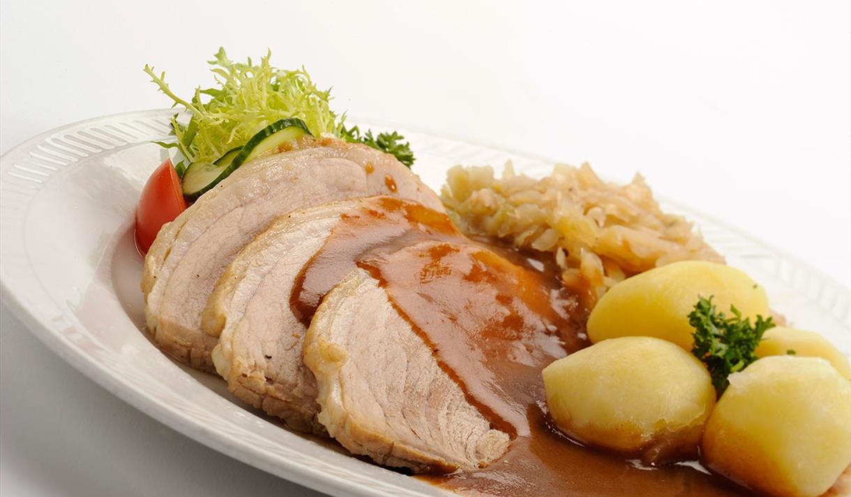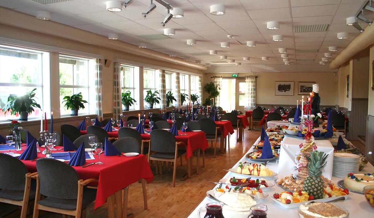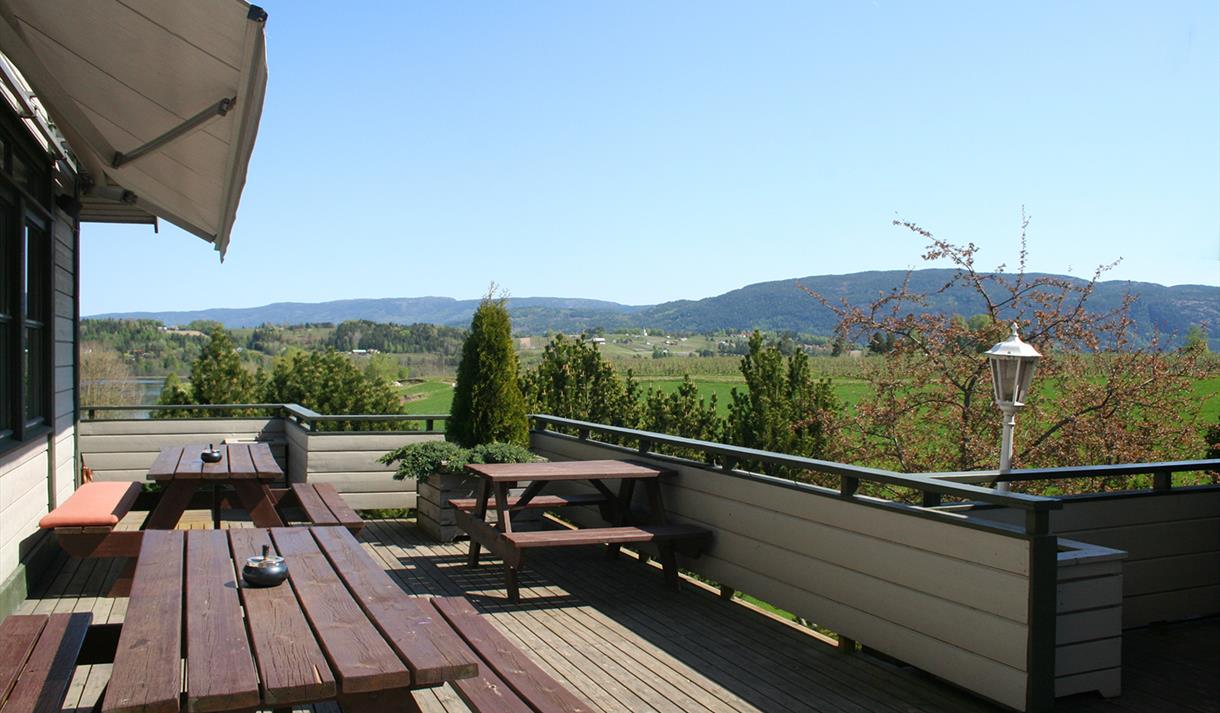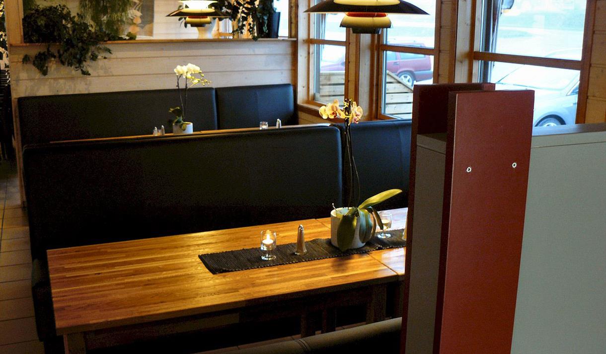 De store lyse lokalene med høyt til tak og plass til 180 personer, har en hyggelig atmosfære og bord i ulike størrelser for både mindre og større grupper.