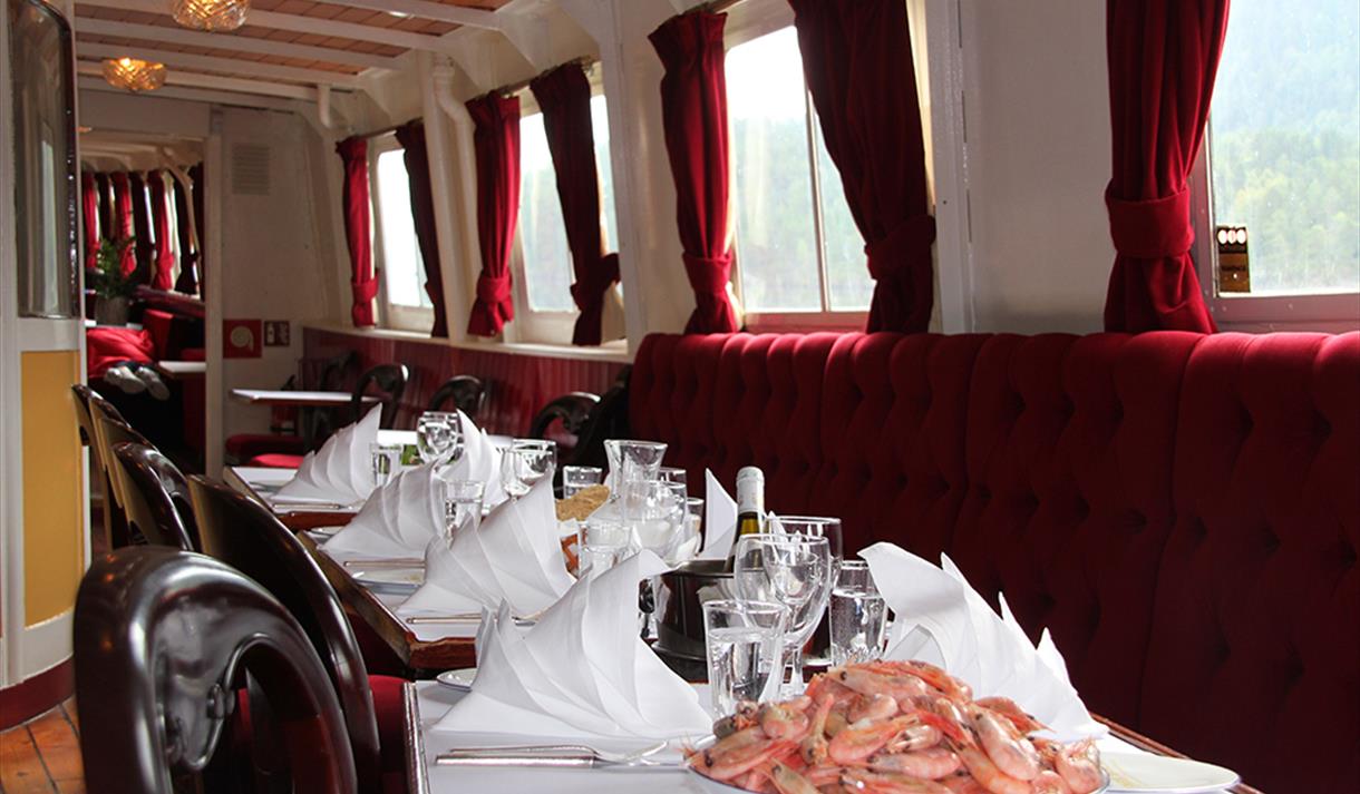 Det er cafe om bord og til grupper tilbyr vi buffet eller 2-retters lunsj.
