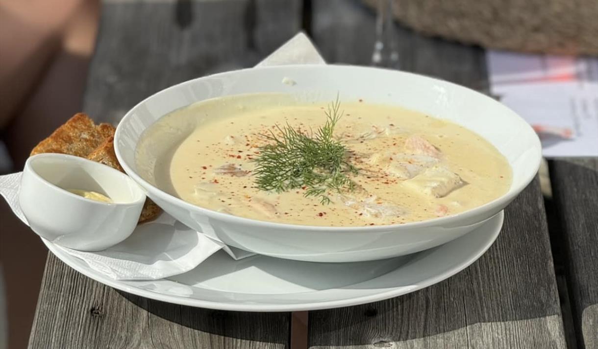 Etter en dag fylt med opplevelser kan du slå deg ned og nyte utsøkt mat og drikke i sjarmerende omgivelser tett opp mot sjøkanten.