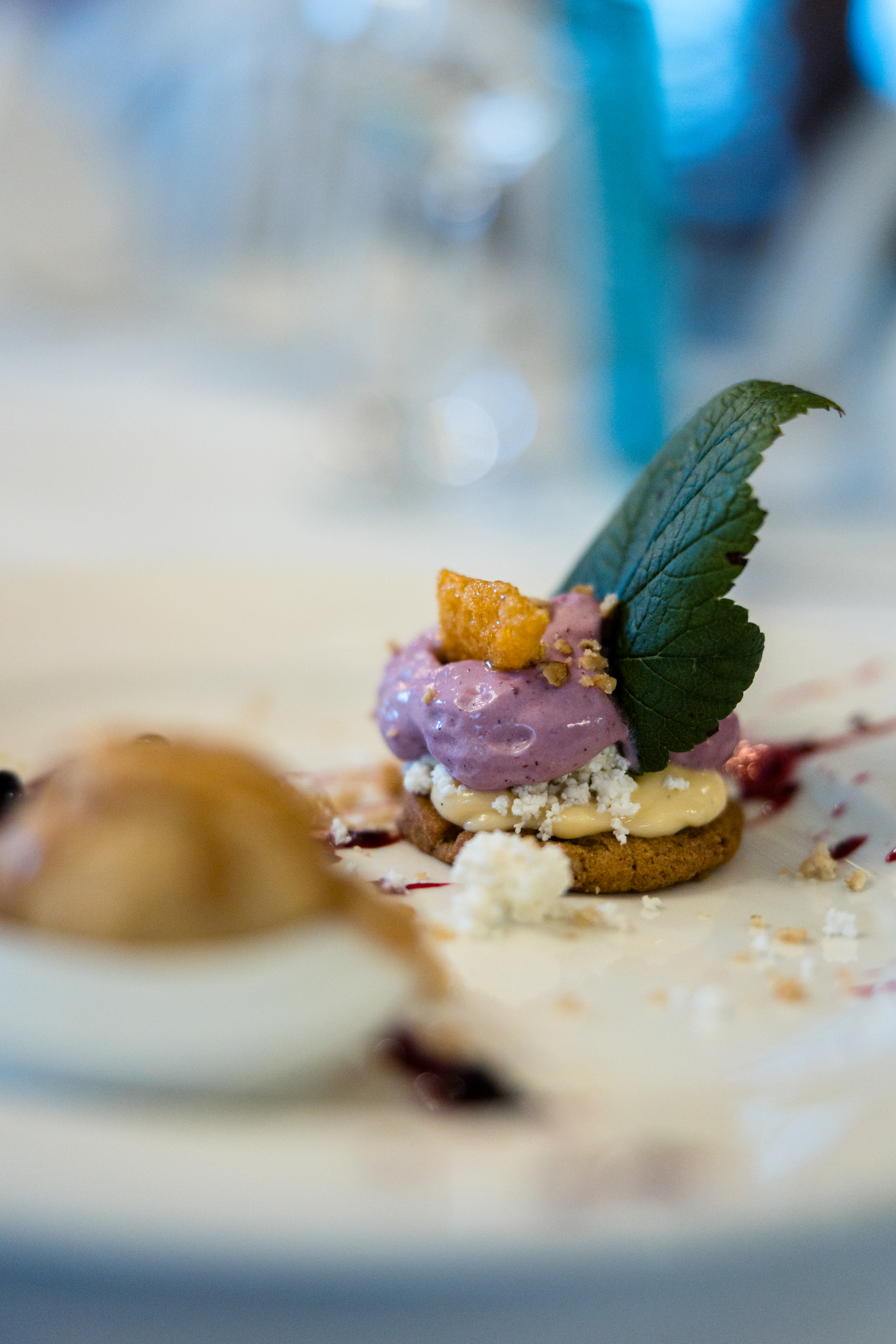 Brunost iskkrem med havrebakels, ystil. solbærsymfoni, brunost-karamellsaus og honningkknas (Stordalen Gardsbruk, Håvardsrud seterliv, Landsverk gård, Eggerud honning)