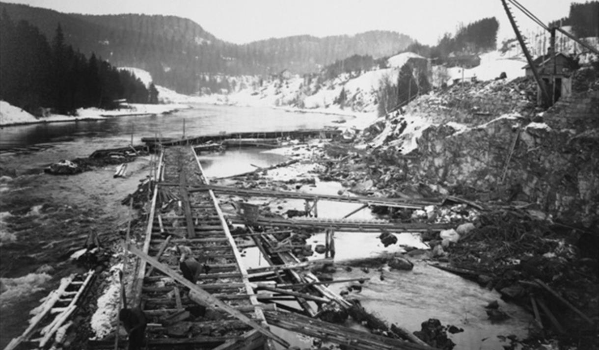Tømmerrenna som går over Tinfosområdet, har frakta tømmer forbi fossene der det ble bygd…