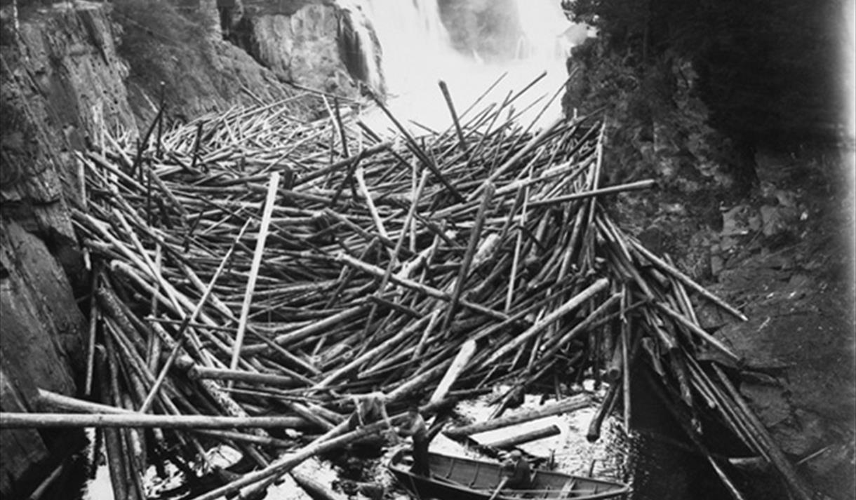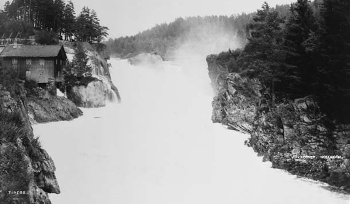 Tømmerrenna som går over Tinfosområdet, har frakta tømmer forbi fossene der det ble bygd…