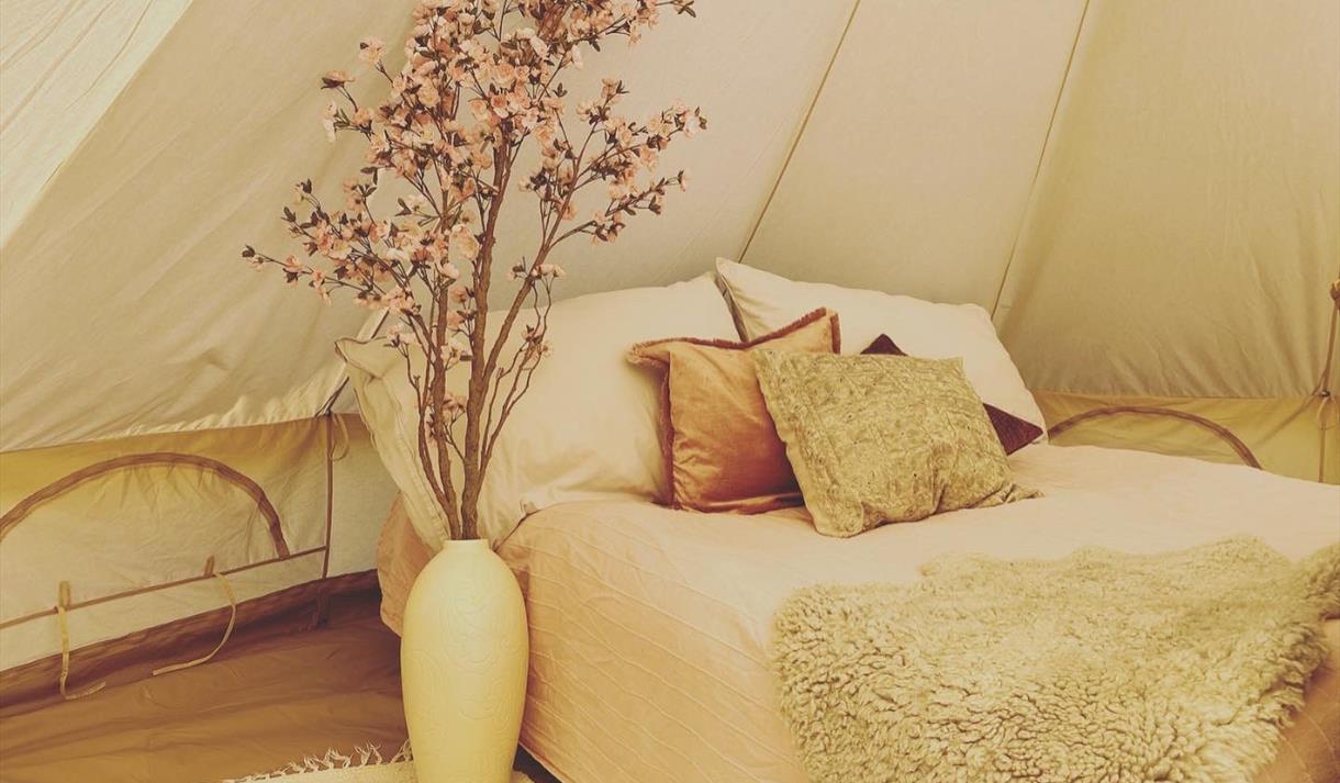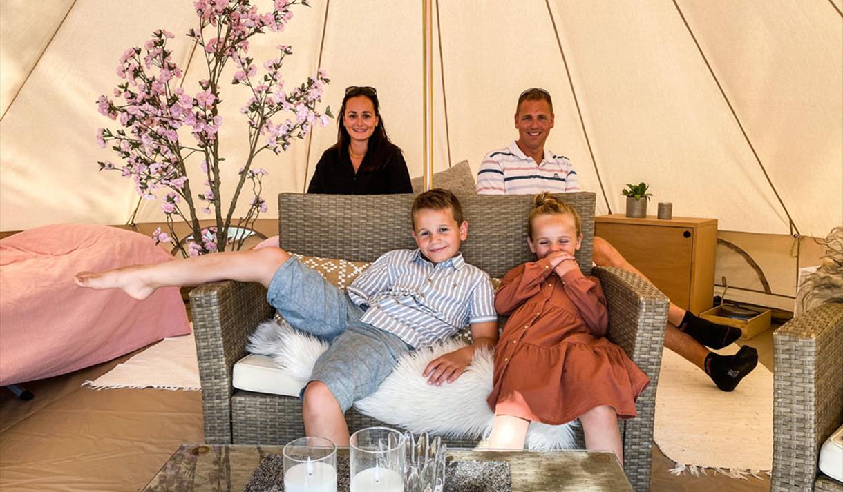 Glampingtelteltet er innredet med en dobbeltseng på 150 cm og en liten sittegruppe. Det er plass til to ekstrasenger ved behov. Sengetøy og håndklær er inkludert. Glampingteltet har en størrelse på 25 m3.