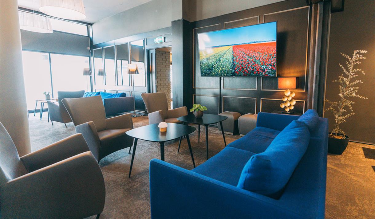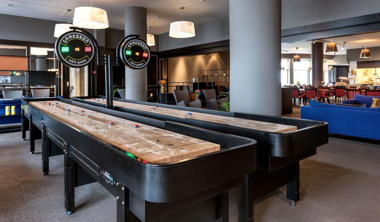 Vi har også en hyggelig lounge med storskjerm samt 2 shufflebord tilgjengelig, som kan benyttes i forbindelse med et arrangement hos oss.
