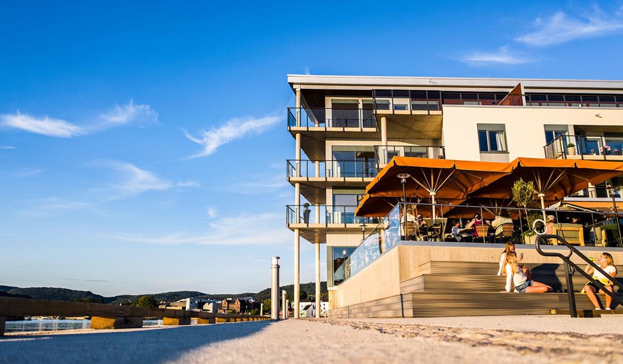På Øya får du byens beste elveutsikt. Lunt og koselig inne på kalde dager, og med en meget attraktiv uteservering om sommeren.