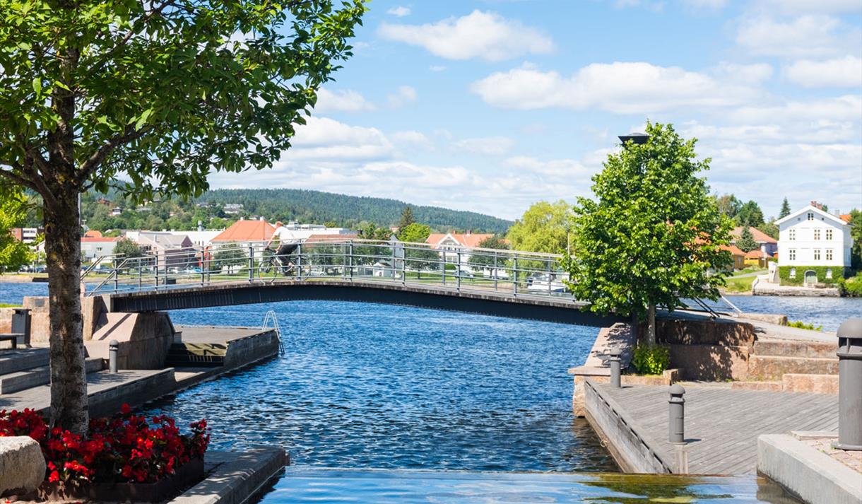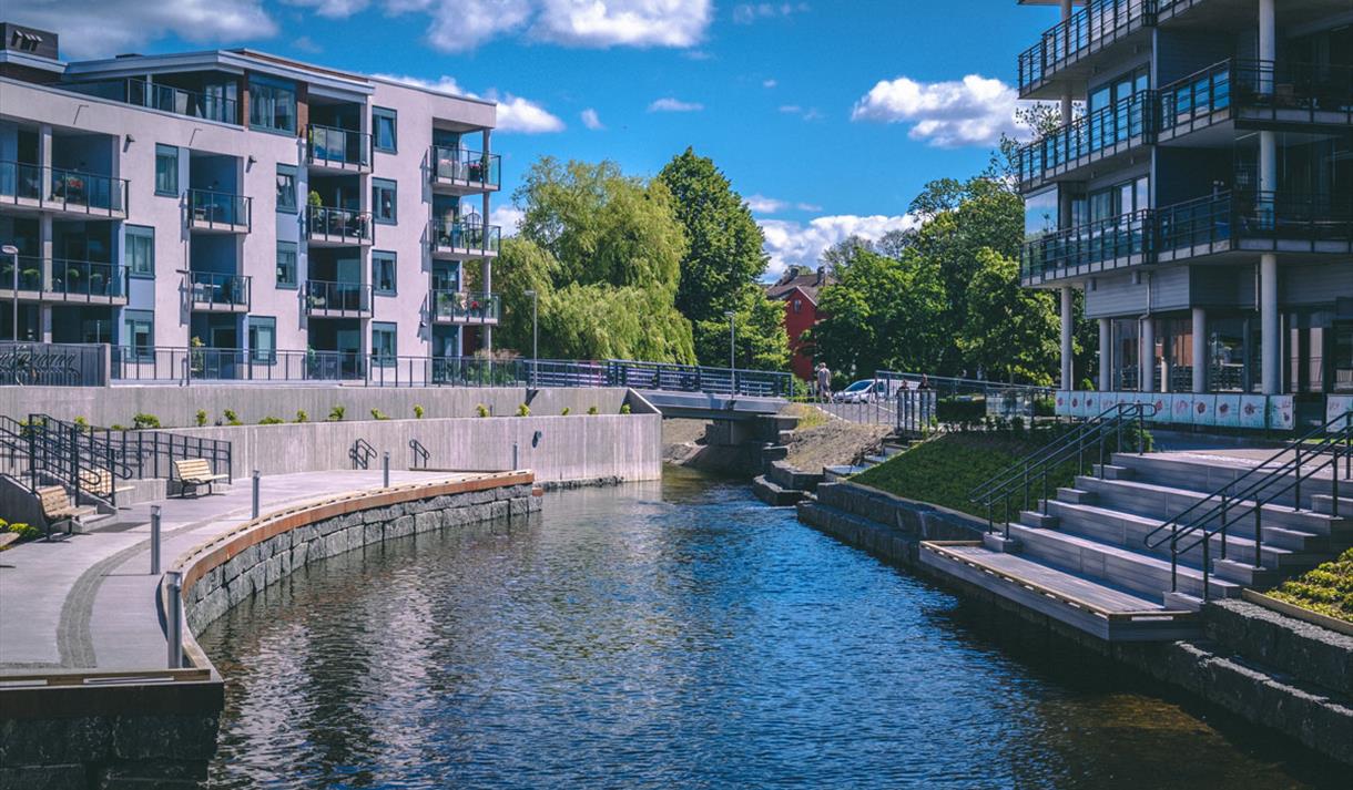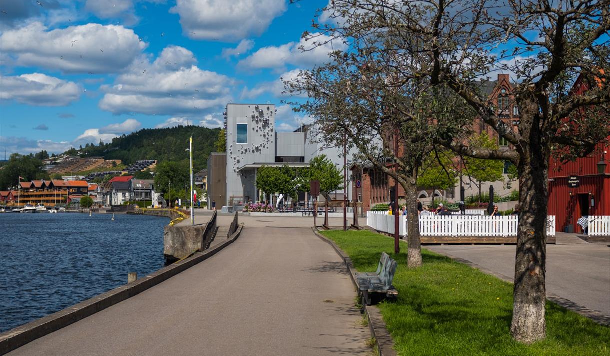 På veien videre opp langs elven kommer du til det vakre og særegne Rådhusamfiet, som ligger ned mot elva foran Porsgrunn Rådhus.