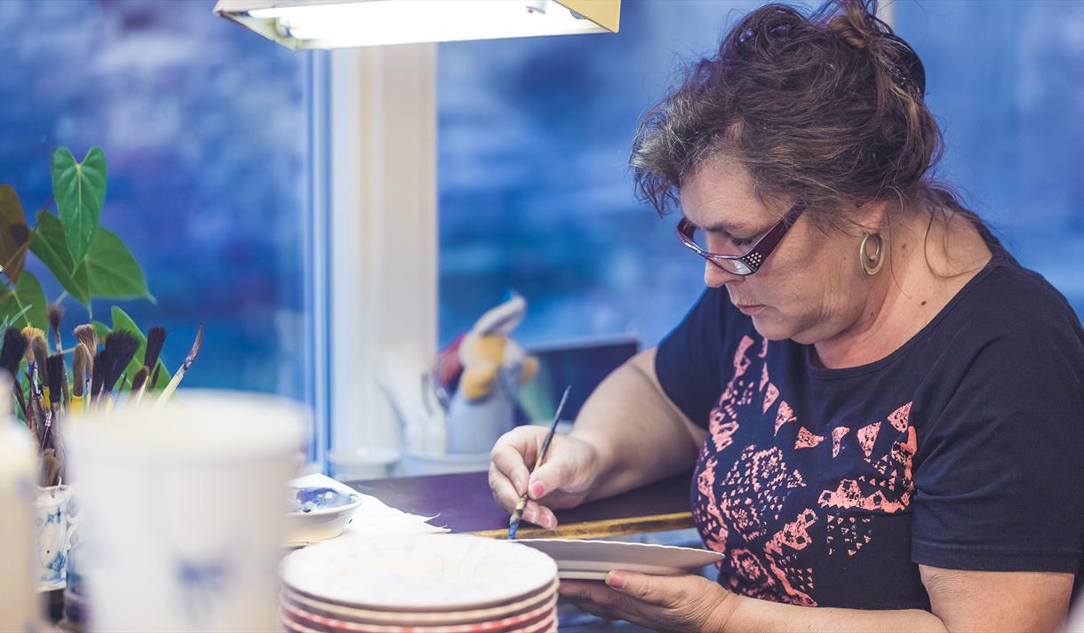 På Porsgrunds Porselænsfabrik kan du se hvordan porselensmalerne dekorerer porselen,…
