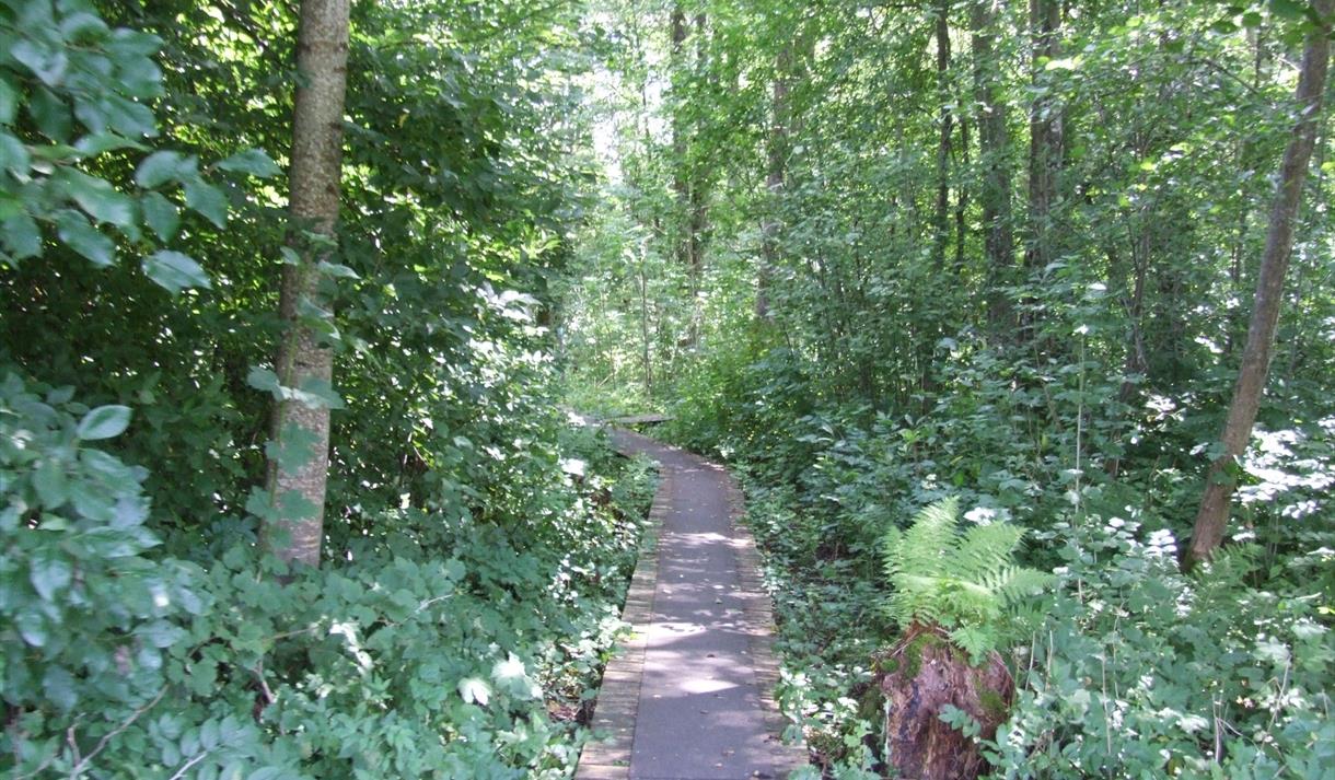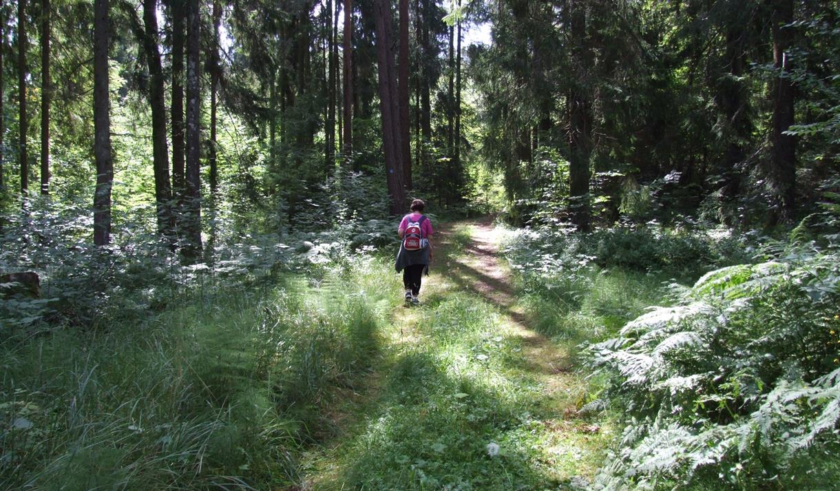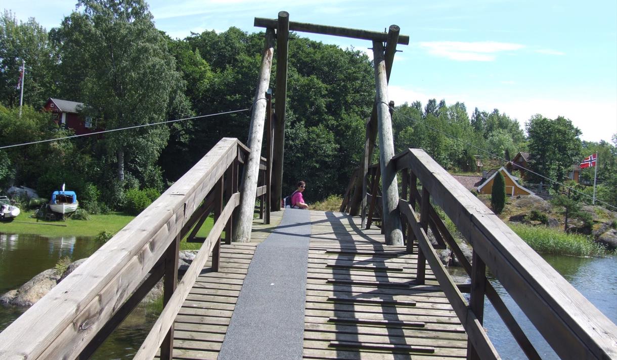 Stien går over "Flyndresundet" til Løvøya med dels hyttebebyggelse og kupert urørt skog.