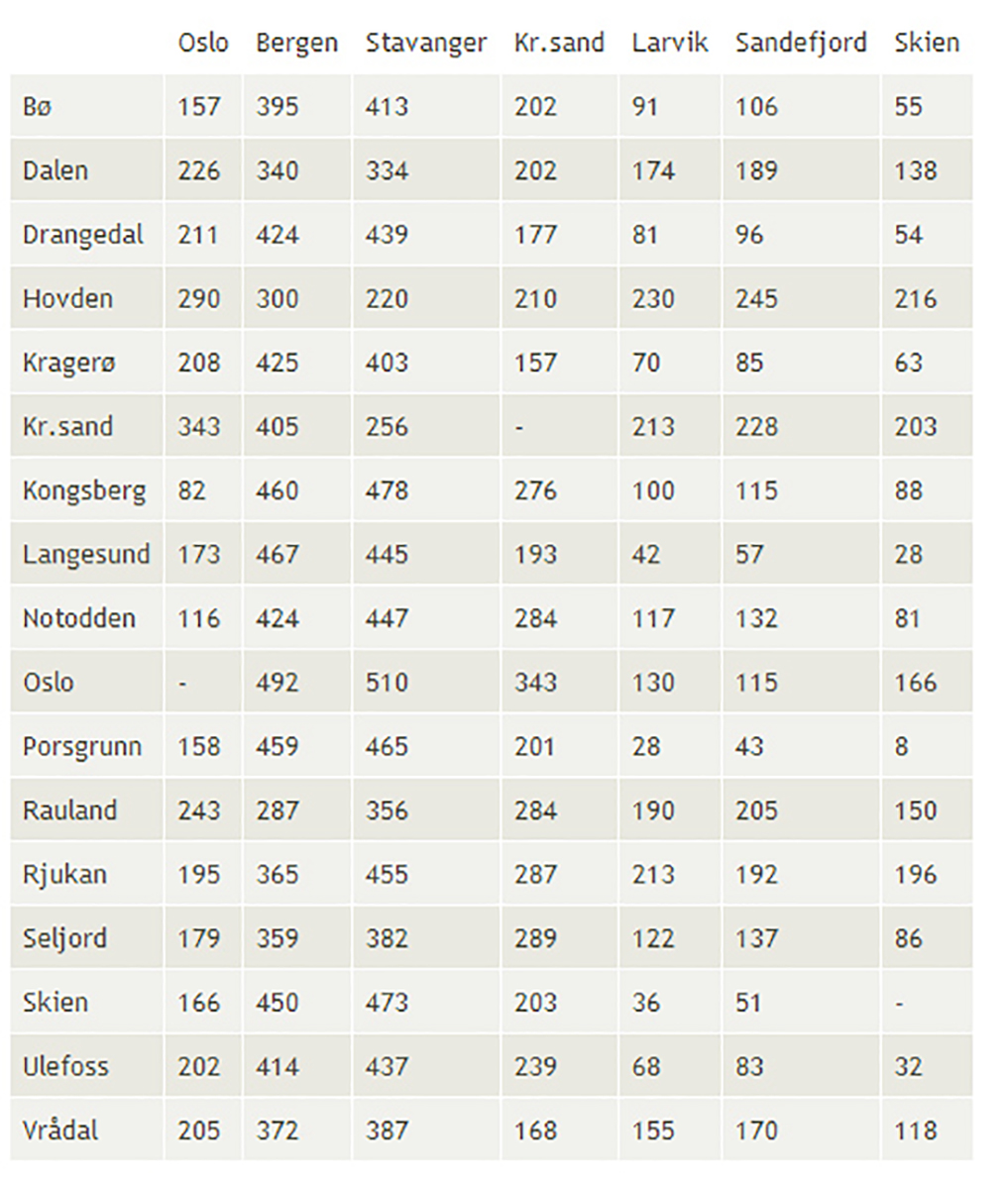 Her er en oversikt over avstander til/fra og innenfor Telemark: