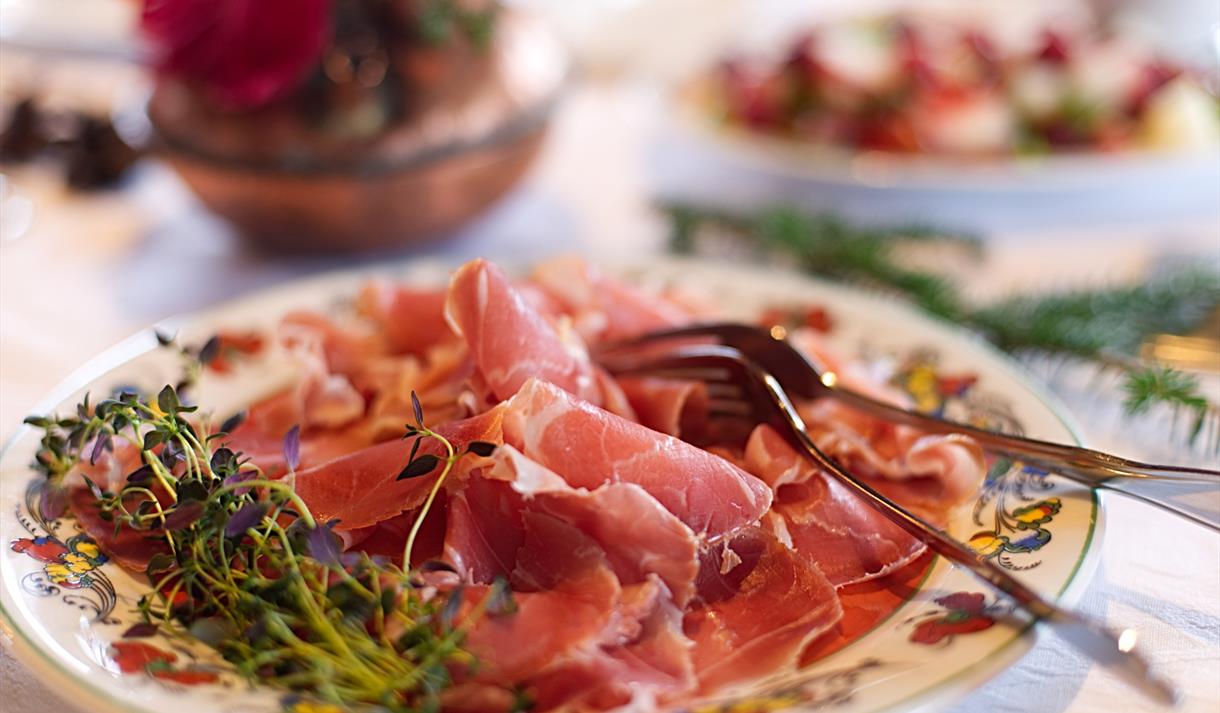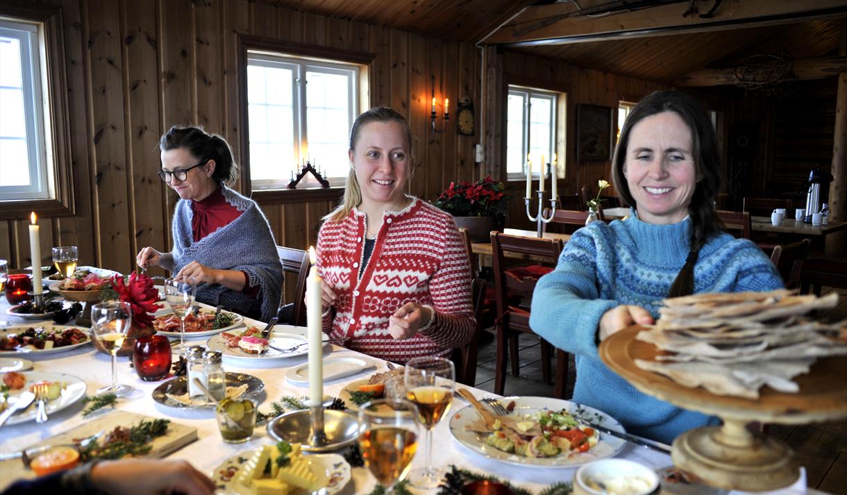 Våre tankar om mat tek utgangspunkt i kvar vi er. På ein fjellgard skal det vere rause porsjonar, dei ekte smakane, det som er nært. Lam og vilt serverer vi ofte. Røykomnen i tunet sørgjer for at de får nyrøykt aure til lunsj eller forrett. Ein ny bakaromn er òg teken i bruk, og vi kan freiste med nysteikt steinomnsbrød.