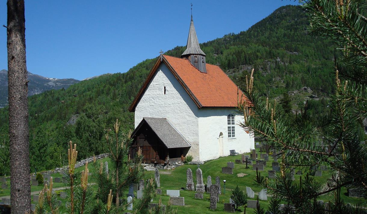 Steinkyrkje i romansk stil bygd ein gong på 1100-talet, og vigsla Heilag Olav. På nord-vest hjørnet er det hogge ut eit andlet som etter ei segn skal vere heilagkongen. Ei segn fortel også at kyrkja vart bygd av ein tusse. Da bygningen var ferdig, datt tussen ned og slo seg i hel. Der han datt, veks det ikkje gras den dag i dag. Altertavla i kyrkja er frå 1588 og døypefonten frå 1600-talet. Riksantikvaren leidde ei omfattande restaurering avslutta i 1972.
