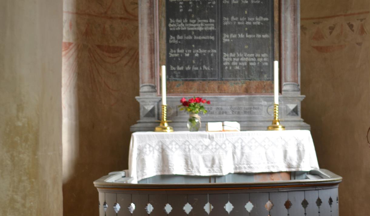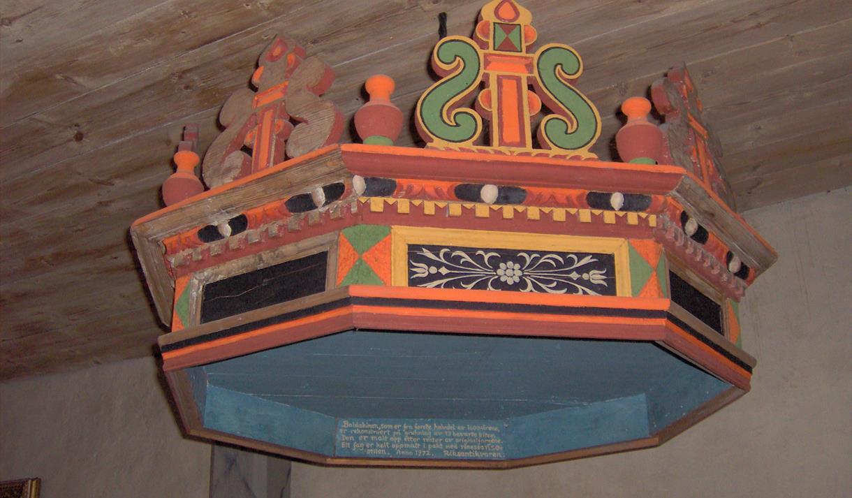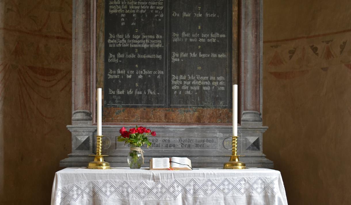 Altertavla frå 1588 er den eldste etterreformatoriske altertavla ein kjenner i Noreg. Motivet er Moses og Aron og lovtavlene med dei ti bod, og i toppstykket ser ein Jahve-teiknet. Dei to gipsfigurane i kyrkja førestiller Peter og Paulus og er laga av den lokale skulptøren Olav Glosimot (1821-1901). Figurane stod opphavleg på alteret og flankerte den dåverande altertavla, måleriet av Nattverden, som no heng over sørportalen og er måla av Harald Lassen i 1879.