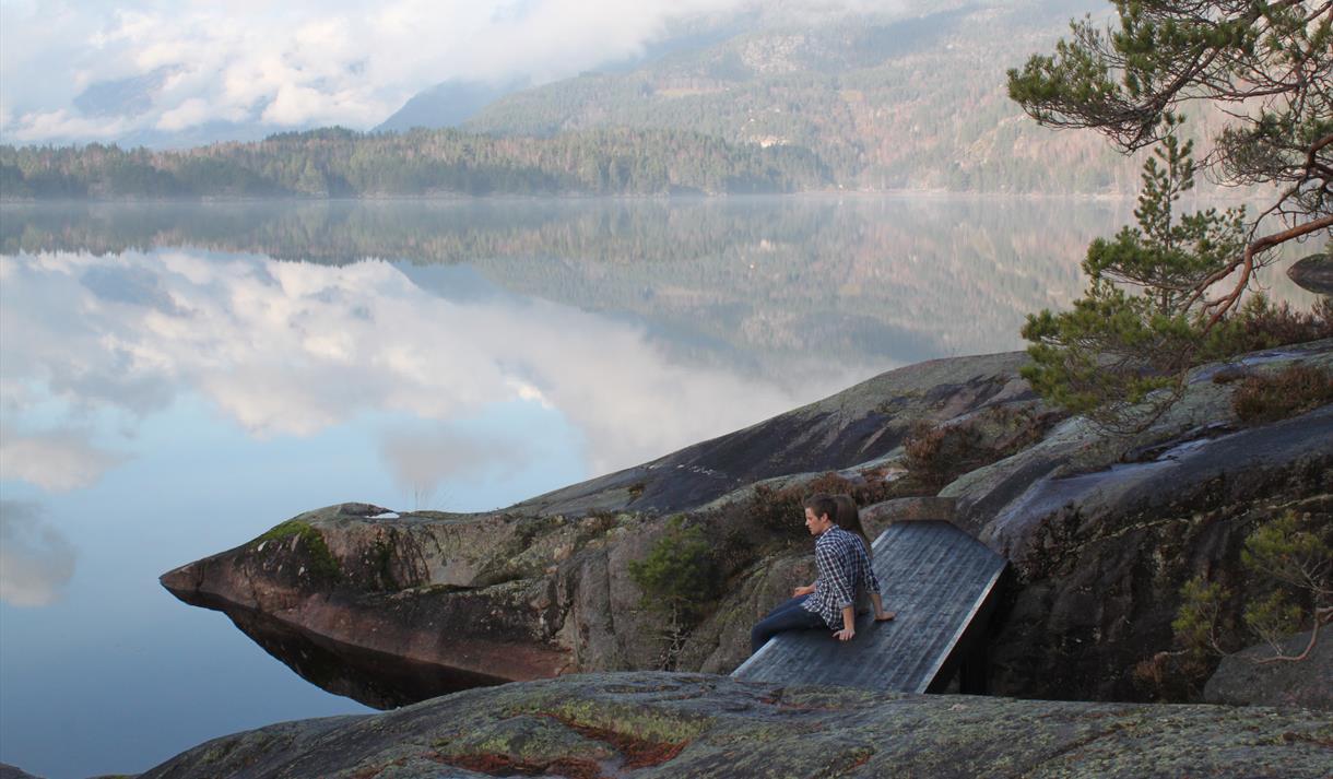 Frå utsiktsposten på Nylende, som nå er tilrettelagt som stoppestad langs vegen, ser du…
