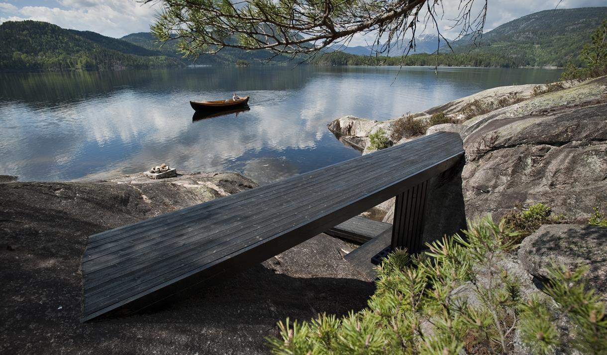 Åtte skulpturelle "kikkeskåp" i stein står ute i landskapet på stader rundt Seljord som…