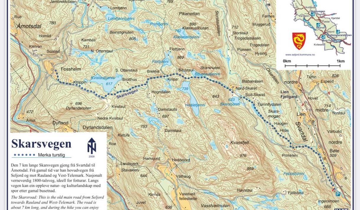 Den 7 km lange Skarsvegen gjeng frå Svartdal til Åmotsdal. Frå gamal tid var han hovudvegen frå Seljord og mot Rauland og Vest-Telemark. Nasjonalt verneverdig 1800-talsveg, ideell for fotturar. Langs vegen kan ein oppleve natur- og kulturlanskap med spor etter gamal busetnad.
