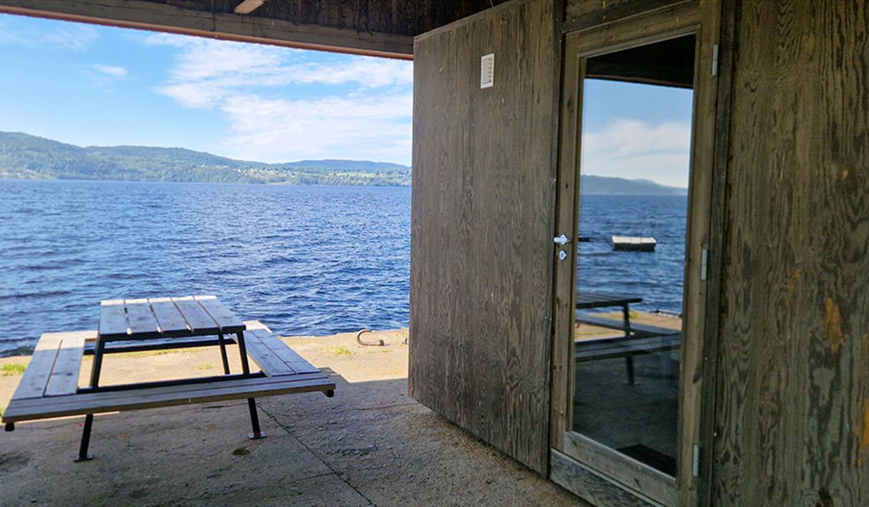 Under det lille halvtaket finnes en kjøkkenbenk for enkel matlaging. Husk å ta med eget kokeapparat. Her finner du også bord og benkesett, slik at du kan nyte måltidet med utsikt over naturen.