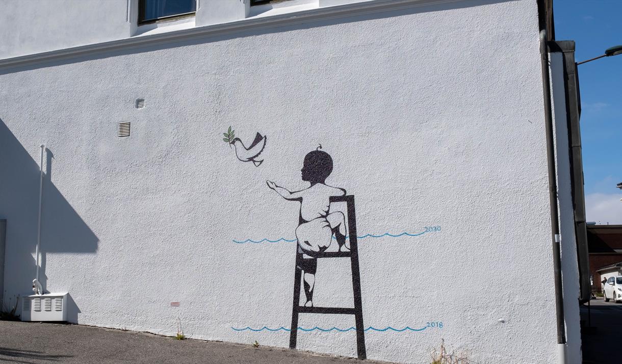 Et enkelt motiv med budskap om å verne om freden og vår natur, og med en antydning om mulig vannstand i 2030.