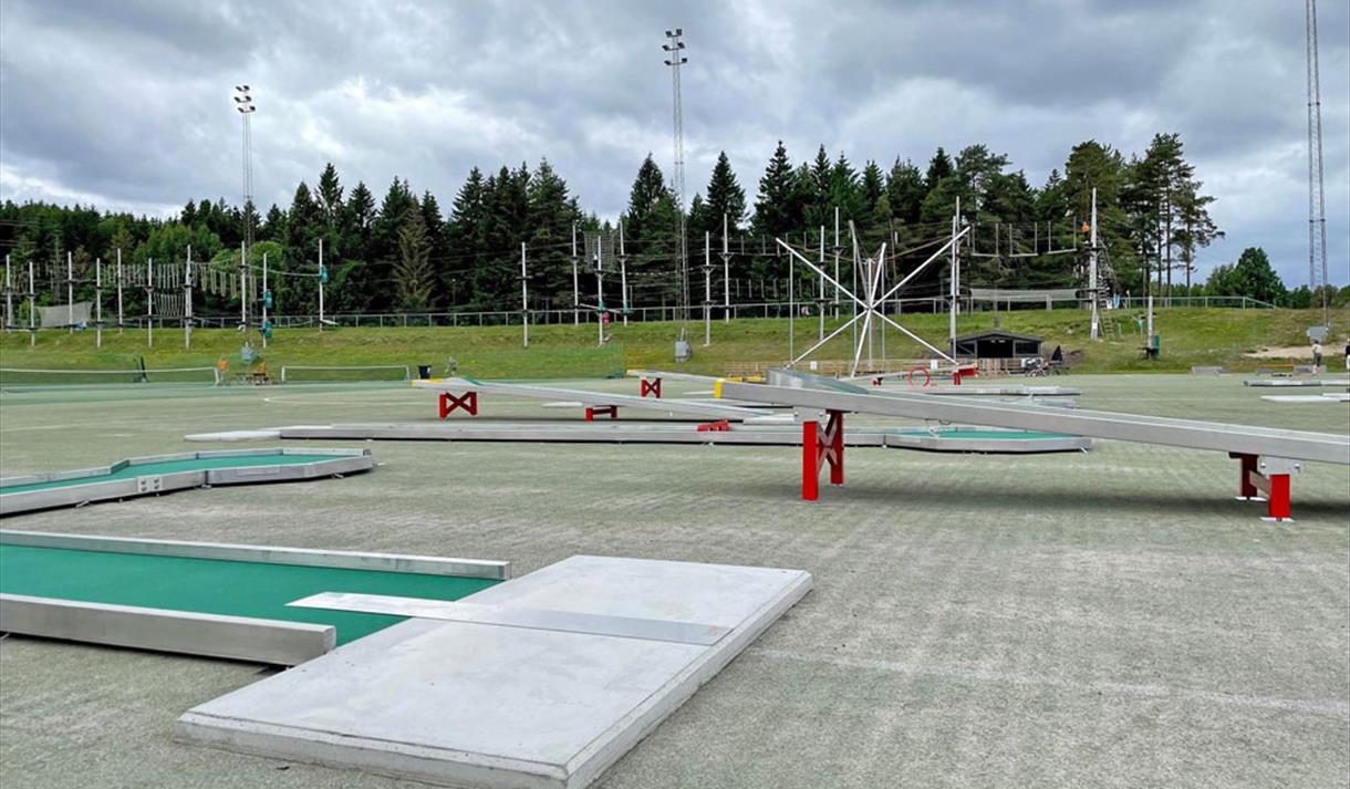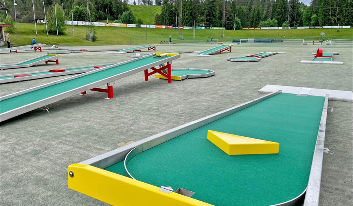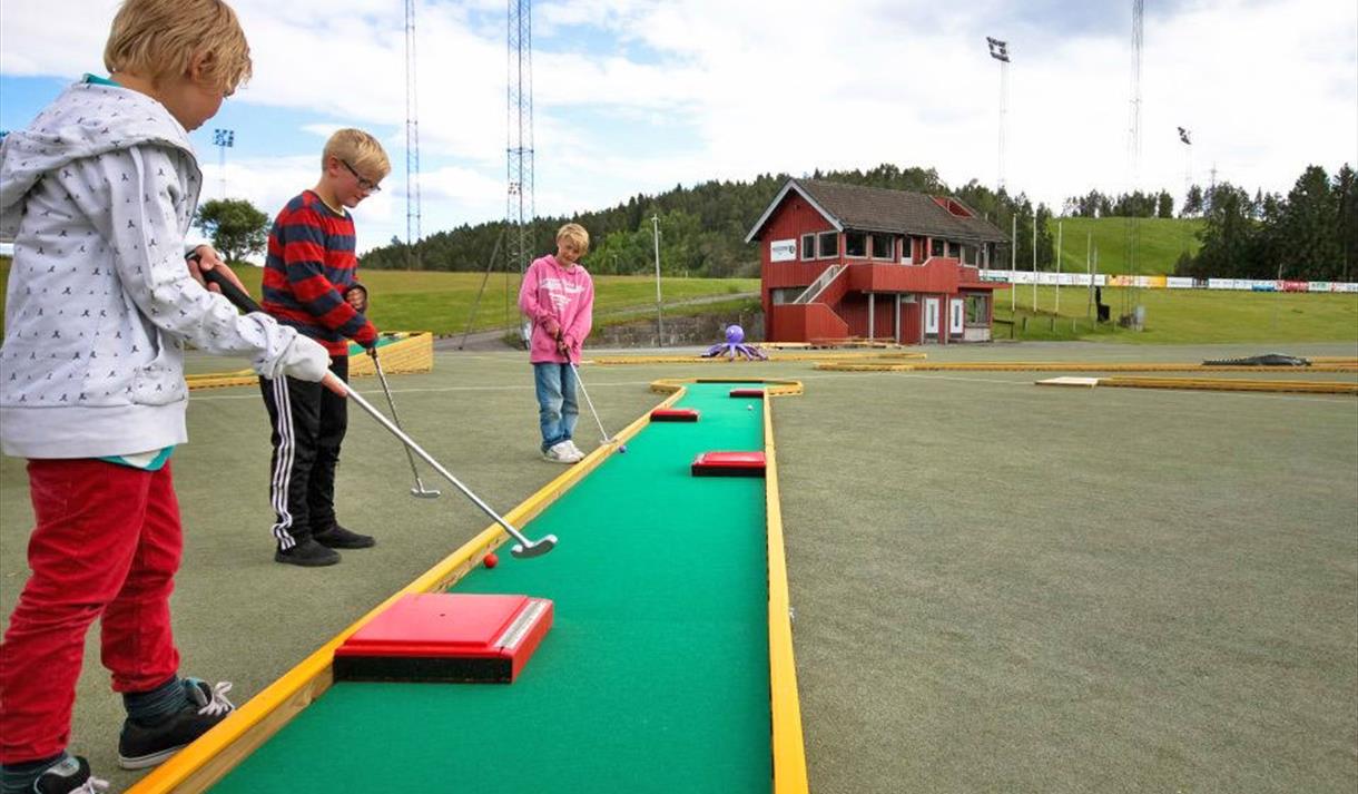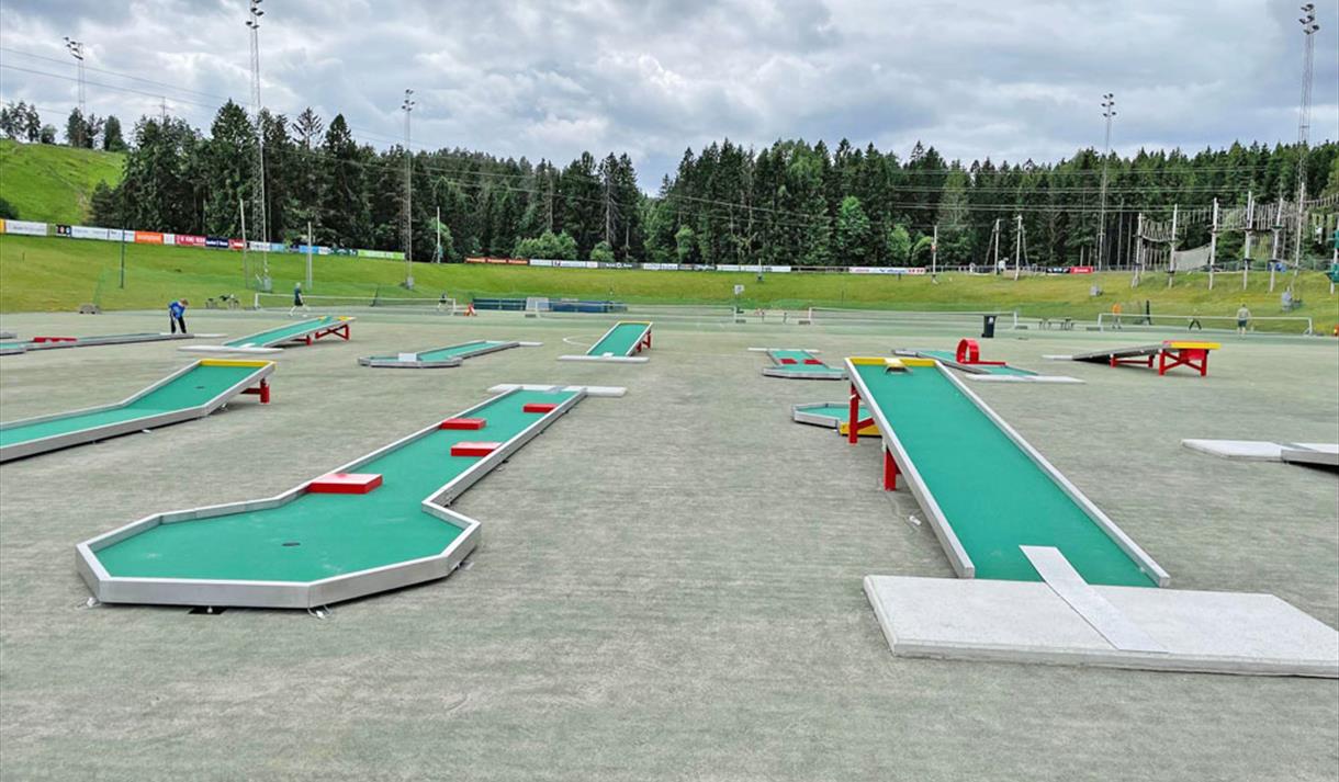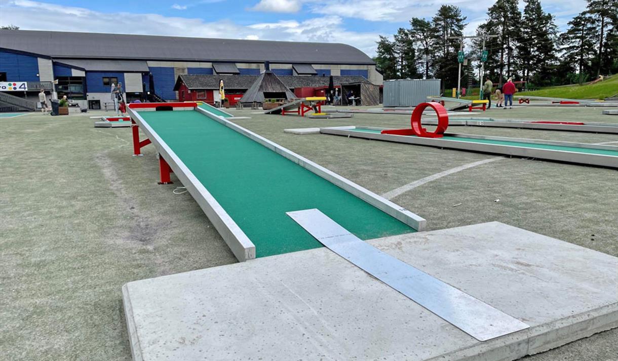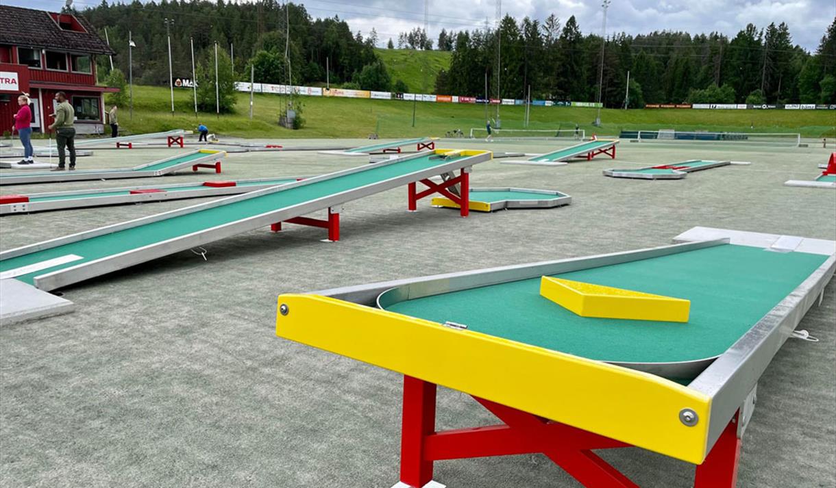 På Skien fritidspark finner du en ny 18 hulls minigolfbane. Banen er laget av betong og rustfritt stål med spilleflate av UV-bestandig nålefiltmatte.