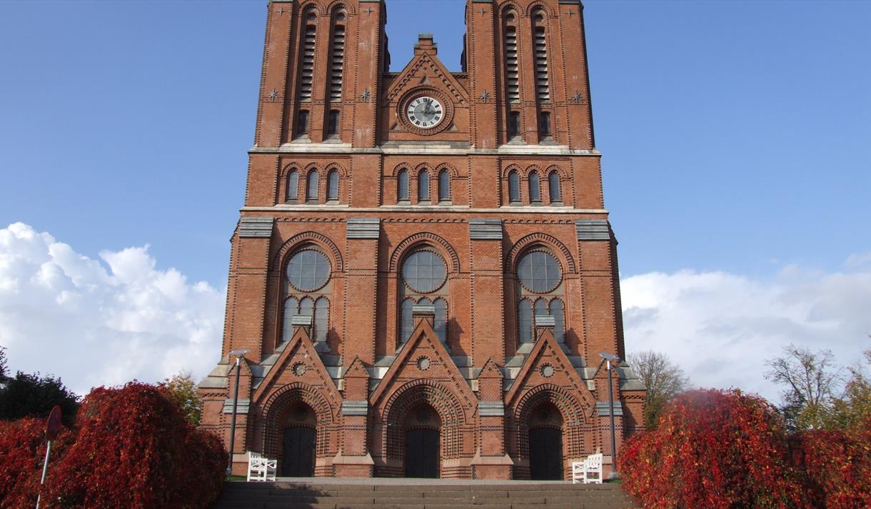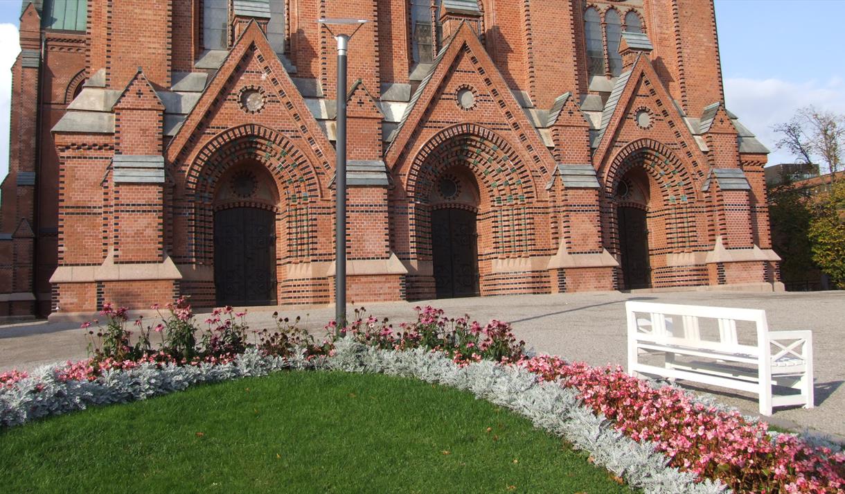 Alteret, som er laget i forskjellige typer stein – har form som en kirkefasade med fem portaler og tre tårn. På det midterste tårnet, ruver et stort kors, som delvis skjuler glassmaleriet av oppstandelsen. Under portalene ses avbildninger av Kristus og de fire evangelister, også malt av Hansen. I sentrum på alterbordet står den syvarmede lysestaken, omgitt av to lysestaker fra Christianskirken.