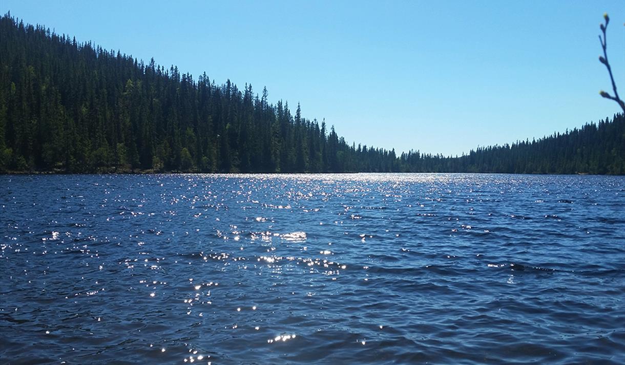 Vi følger i stedet grusvegen inn mot Gjevarvatn på flotte grusveger langs stranden i skogs- og myrterreng til Langlim.