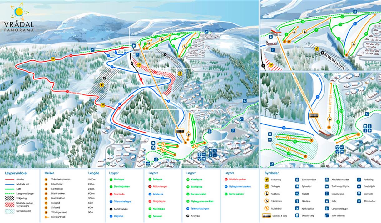 Skisenteret har nå 18 nedfarter på i alt 15 km og 8 heiser, inkludert 8-seters stolheis. Vrådal Panorama er et skianlegg for hele familien med løyper i alle vanskelighetsgrader. Forholdene er lagt til rette uansett om du vil stå slalåm, kjøre utfor, stå telemarkski eller leke deg på snøbrett.