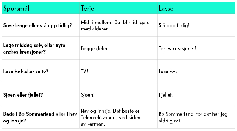 Begge programlederne har erfaring innenfor matyrket. Terje, vinner av Masterchef Norge og Camp Kulinaris, og Lasse, som er utdannet kokk, gleder seg til å utforske matkulturen i Telemark og er spesielt spent på råvaretradisjonene i regionen. "Å få tilgang til et kjøkken og noen gode råvarer så vi kan diske opp med forskjellige lokale retter. Det er sånne ting som jeg elsker og håper vi får til" drømmer Terje, mens Lasse helst vil få maten servert. "Kanskje jeg til og med kan lage og Lasse nyte en god frokost på Gaustatoppen. Tenk det? Stå der, på toppen av Norge med nystekt bacon og nyte utsikten".
