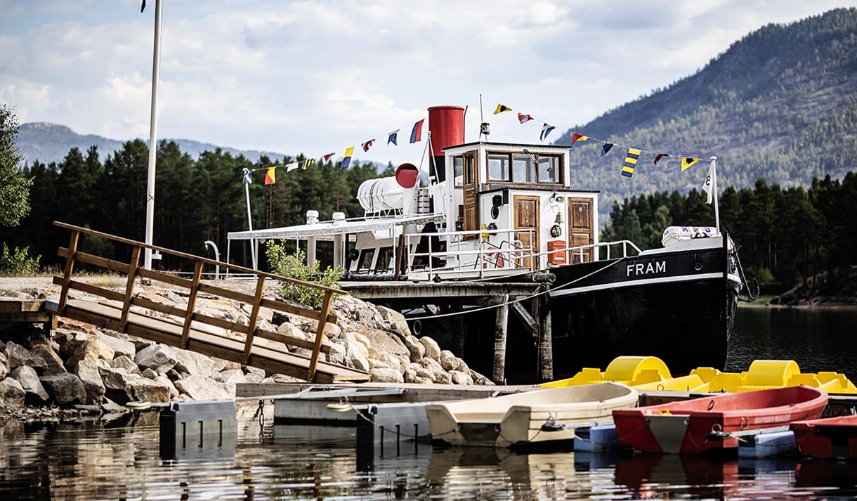 the veteran boat MS Fram on NisserBåtcruise med veteranbåten M/S Fram, Vrådal, KviteseidVeteranbåten M/S Fram seiler sightseeingturer i vakkert øylandskap øverst i Nisser. Båten går i rute 2 – 4 ganger i uken fra mai til oktober.