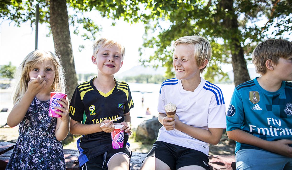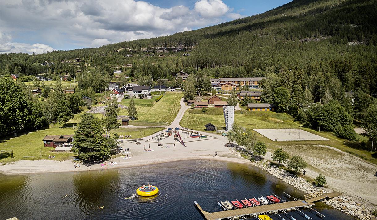 children jump on the trampoline at Straand Sommerland in VrådalStraand Sommerland - aktivitetsområde, KviteseidStraand Sommerland ligger ved vannkanten i Vrådal. Her finner du lekeplass, sandstrand, båtutleie, sandvolleyball og sommerkafè.