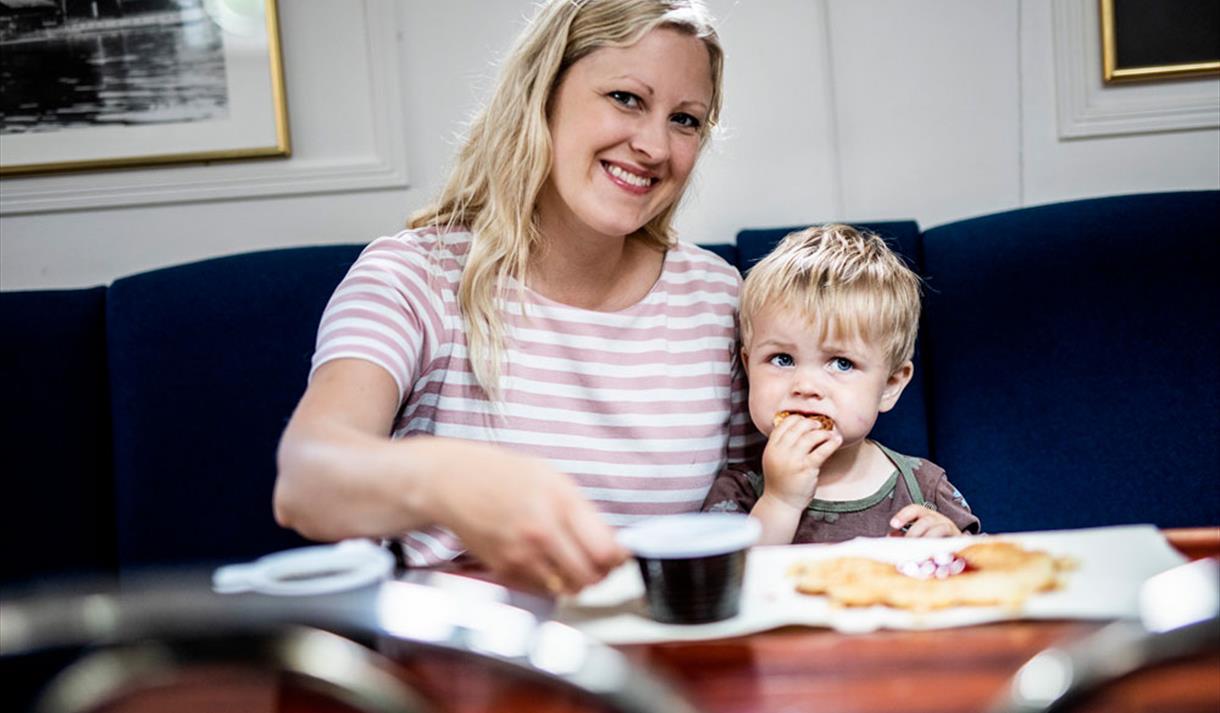 Det er kiosk om bord og du har mulighet for å forhåndsbestille servering om bord.